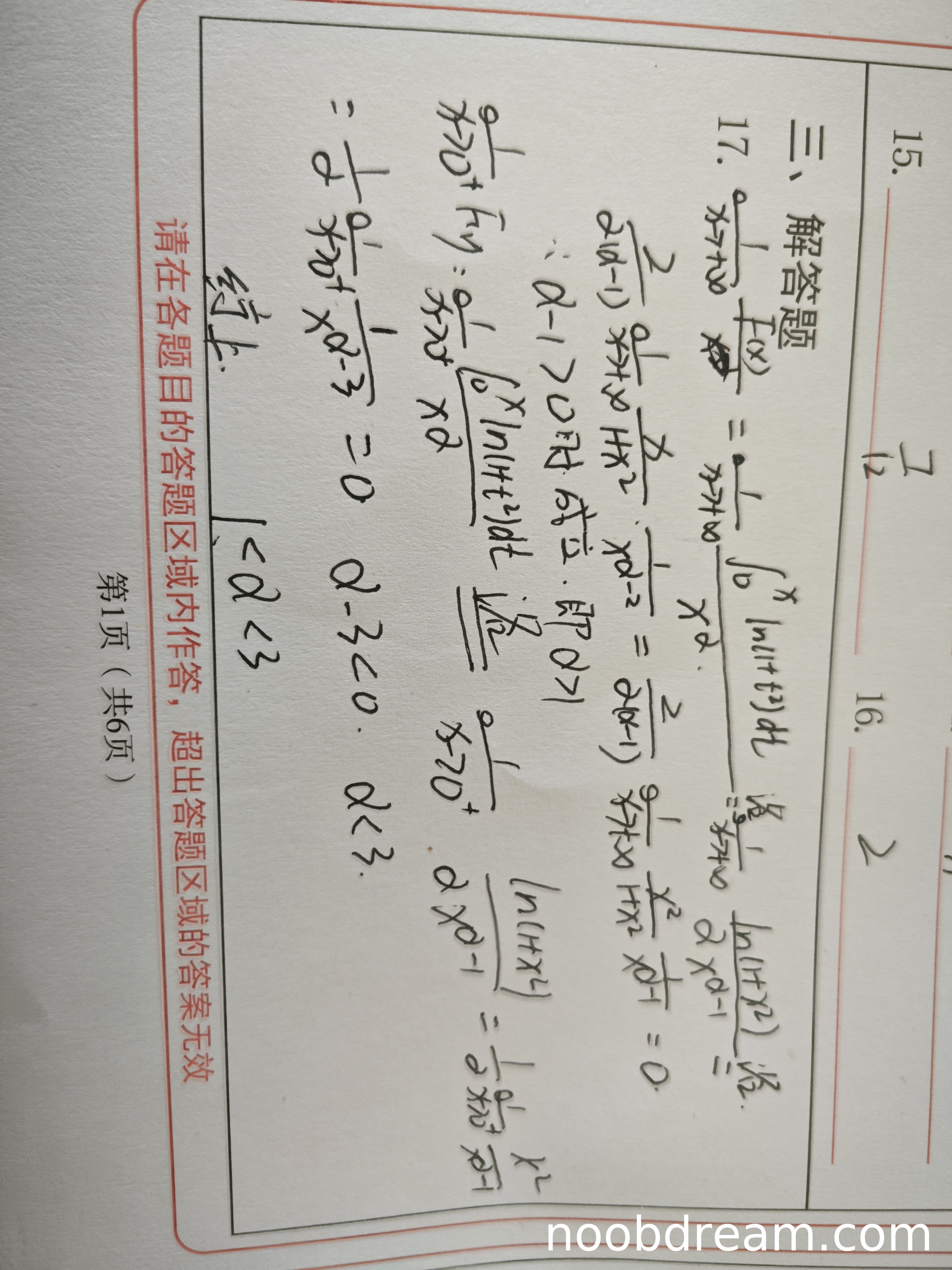 学生作答与题目要求完全不符。题目中给出的函数是 \( F(x)=\frac{\int_{0}^{x}\ln(1 + t^{2})dt}{x^{3a}} \),并给出了两个极限条件。然而,学生的解答过程讨论的是一个完全不同的函数形式 \( F(x)=\frac{1}{x - x_0}\int_{x_0}^{x}\ln(1 + t)dt \) 以及一个包含参数 \( a \) 的方程,这与原题无关。整个解答过程没有针对原题的两个极限条件进行分析和计算,逻辑起点错误,导致后续推导全部偏离题意。因此,本题无法得分。