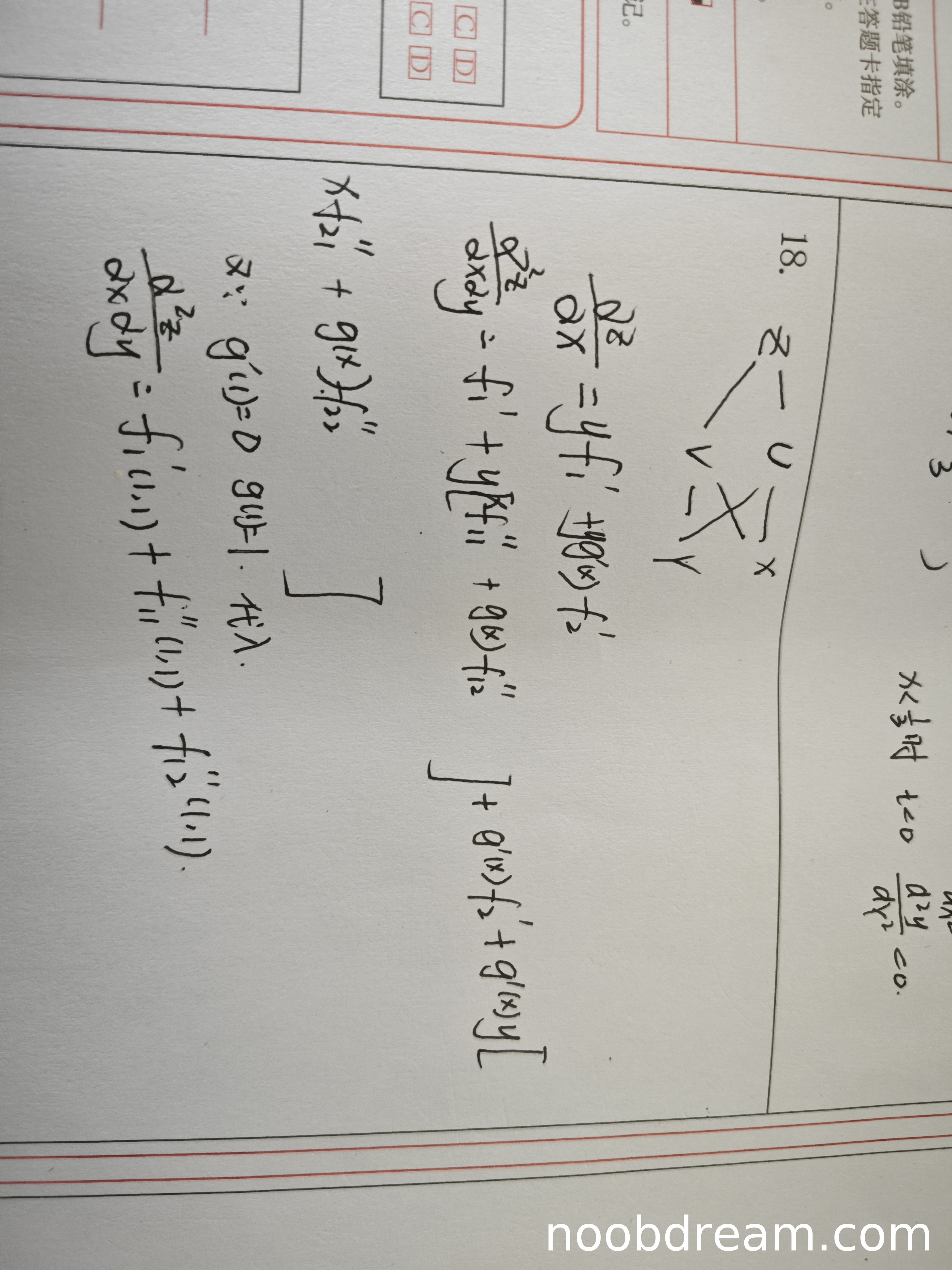第二次识别结果中,一阶偏导数计算正确,二阶偏导数计算时漏掉了关键项 \( xf_{21}'' \),且最终结果多出了 \( f_{12}''(1,1) \) 项。虽然正确使用了 \( g'(1)=0 \) 的条件,但由于漏项导致结果错误。根据逻辑错误扣分原则,扣除4分,得6分。