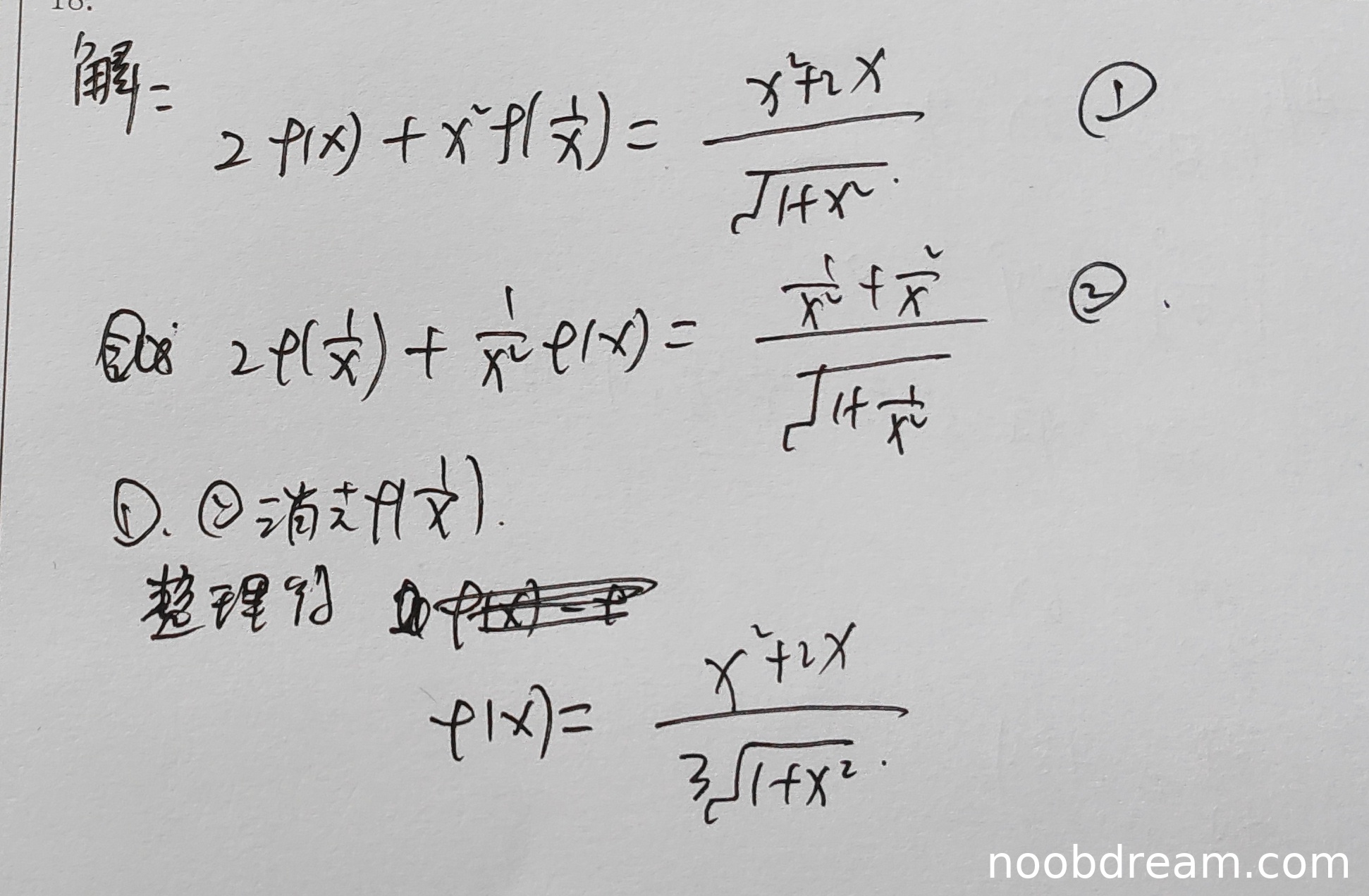 学生正确构建了方程组,通过变量替换得到第二个方程,这是正确的思路。但在第二个方程的右边分子部分出现了错误:第一次识别写为 \(\frac{1}{x^2} + \frac{1}{x^2}\),第二次识别写为 \(\frac{1}{x^2} + \frac{1}{x}\),而标准答案应为 \(\frac{1}{x^2} + \frac{2}{x}\)。这个错误导致后续解出的f(x)不正确。由于这是关键的计算错误,扣3分。得2分。