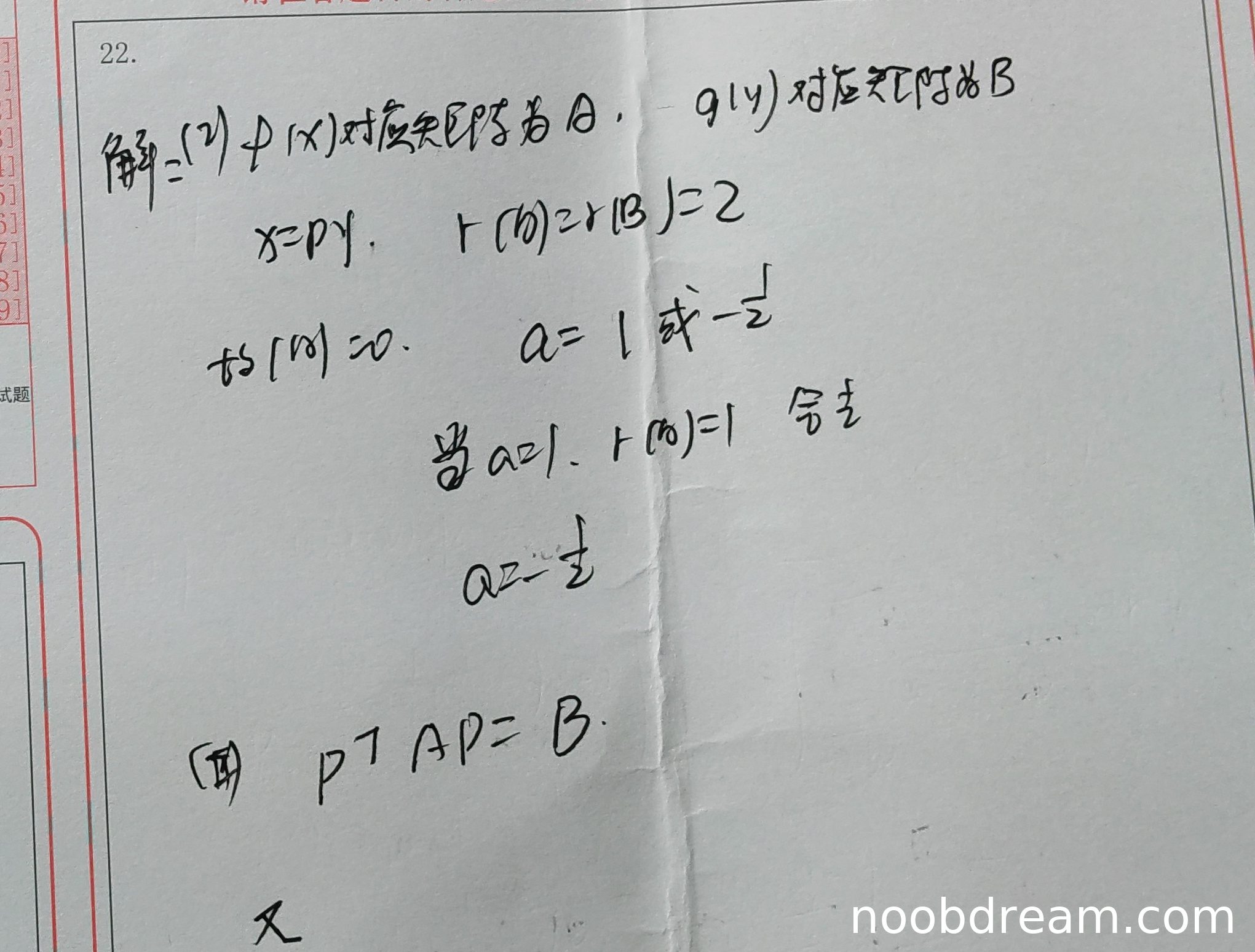 学生只写出了变换关系 PᵀAP = B(第二次识别)或 P⁻¹AP = B(第一次识别),但没有给出具体的可逆矩阵 P。第一次识别中的 P⁻¹AP = B 是错误的合同变换形式。由于完全没有完成求 P 的任务,扣5.5分。得分:0分