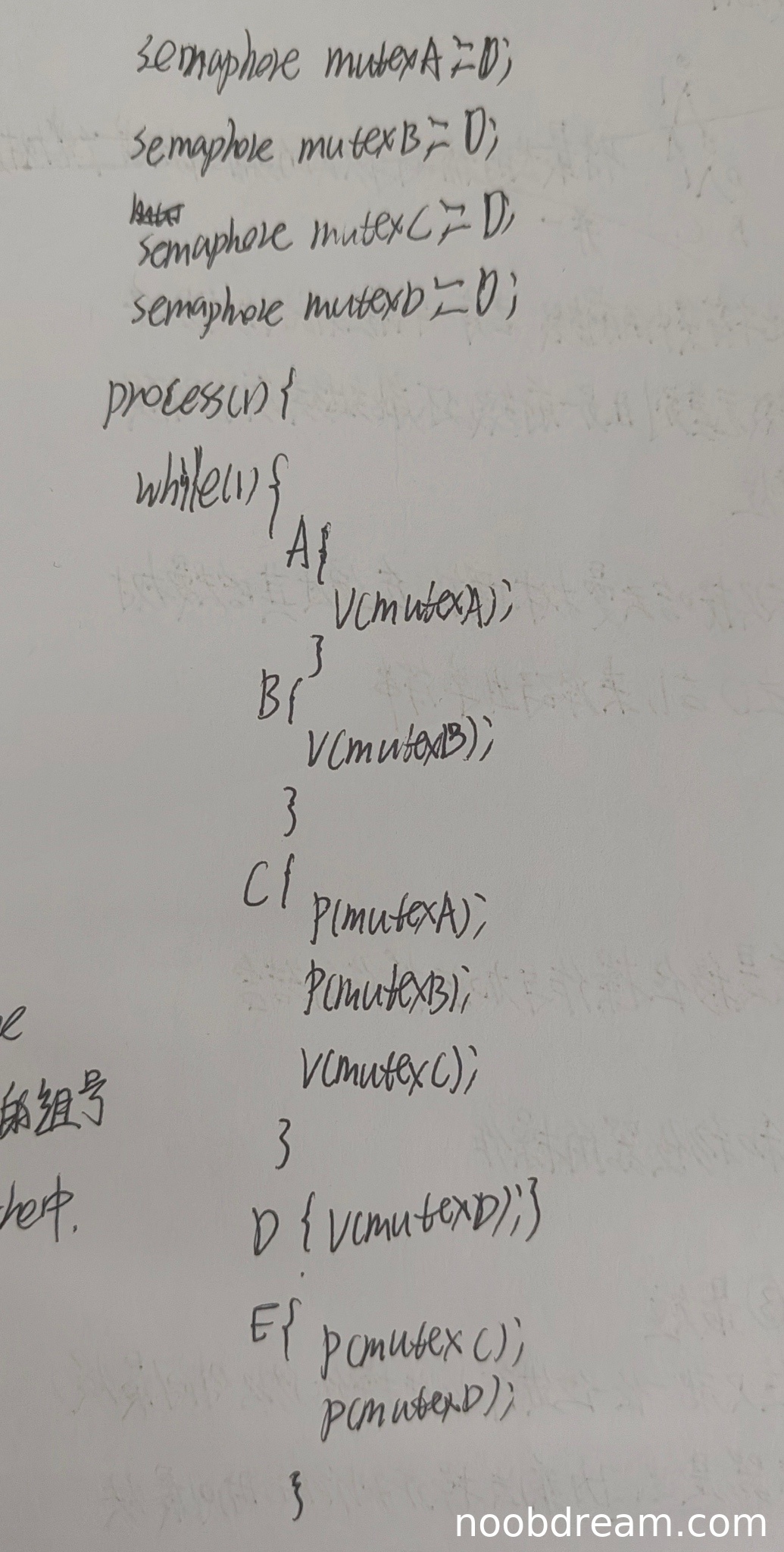 这完全符合题目要求的同步关系:C必须在A和B完成后执行,E必须在C和D完成后执行。
