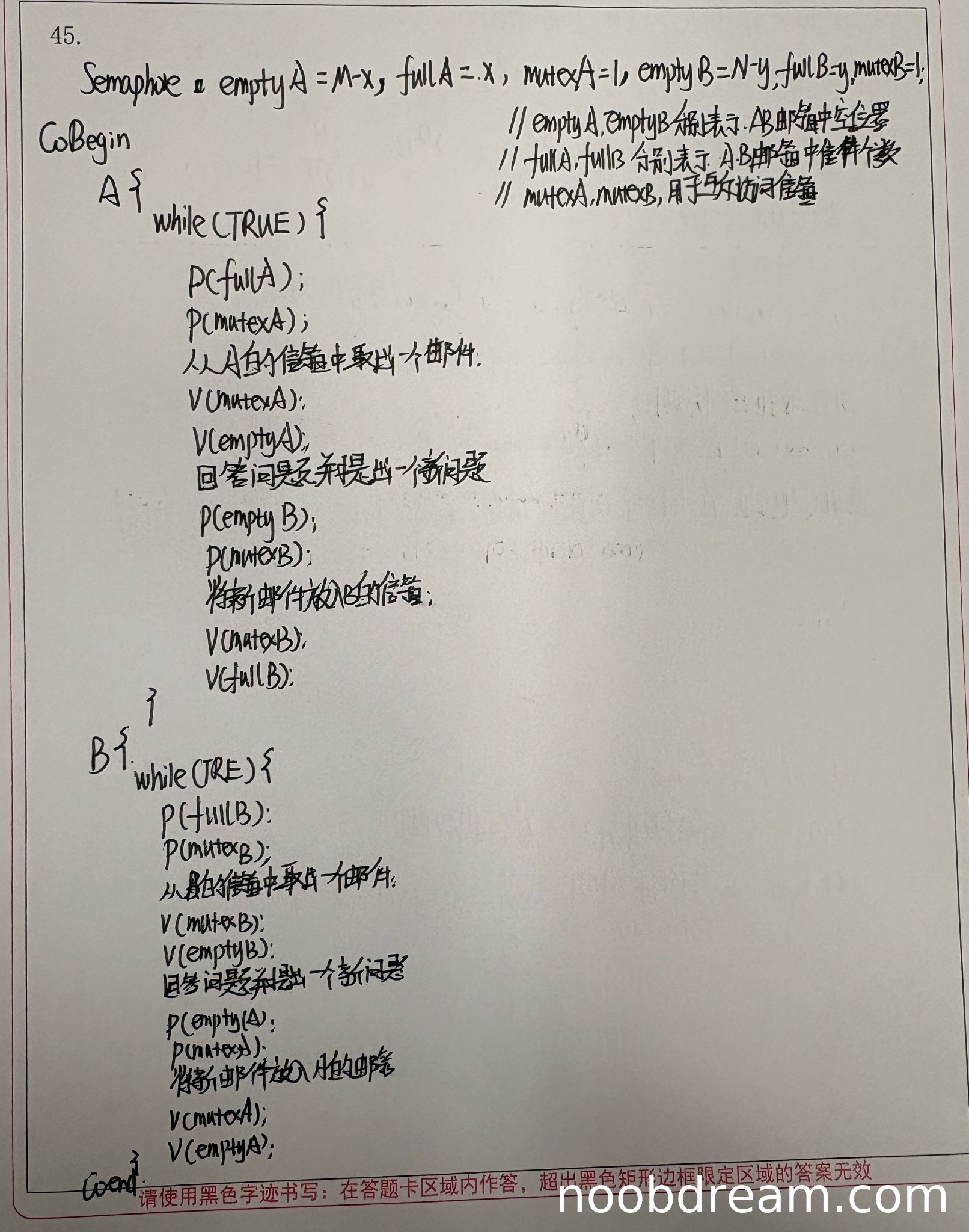 理由:A进程的代码完全正确。在取邮件时先P(fullA)再P(mutexA),放邮件时先P(emptyB)再P(mutexB),符合同步互斥的正确顺序。所有V操作的位置和信号量使用都正确。