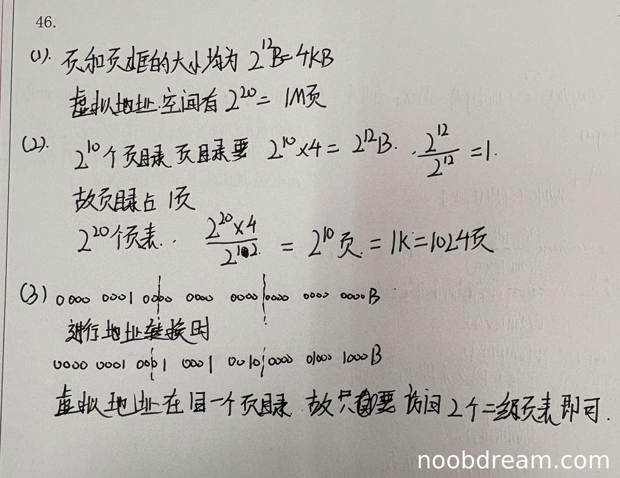 学生正确计算出页和页框大小为4KB(2^12B),虚拟地址空间大小为1M页(2^20页),与标准答案完全一致。得2分。