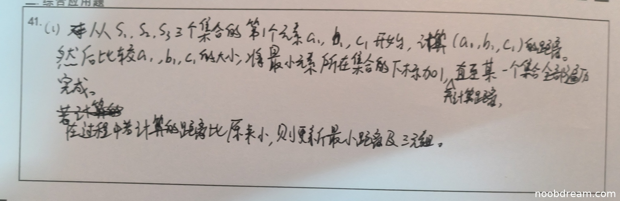 理由:学生的基本设计思想描述清晰,与标准答案中的方法二(同向多指针)思路一致。正确描述了从三个数组的第一个元素开始,计算距离后移动最小元素所在数组的指针,并在过程中更新最小距离的方法。