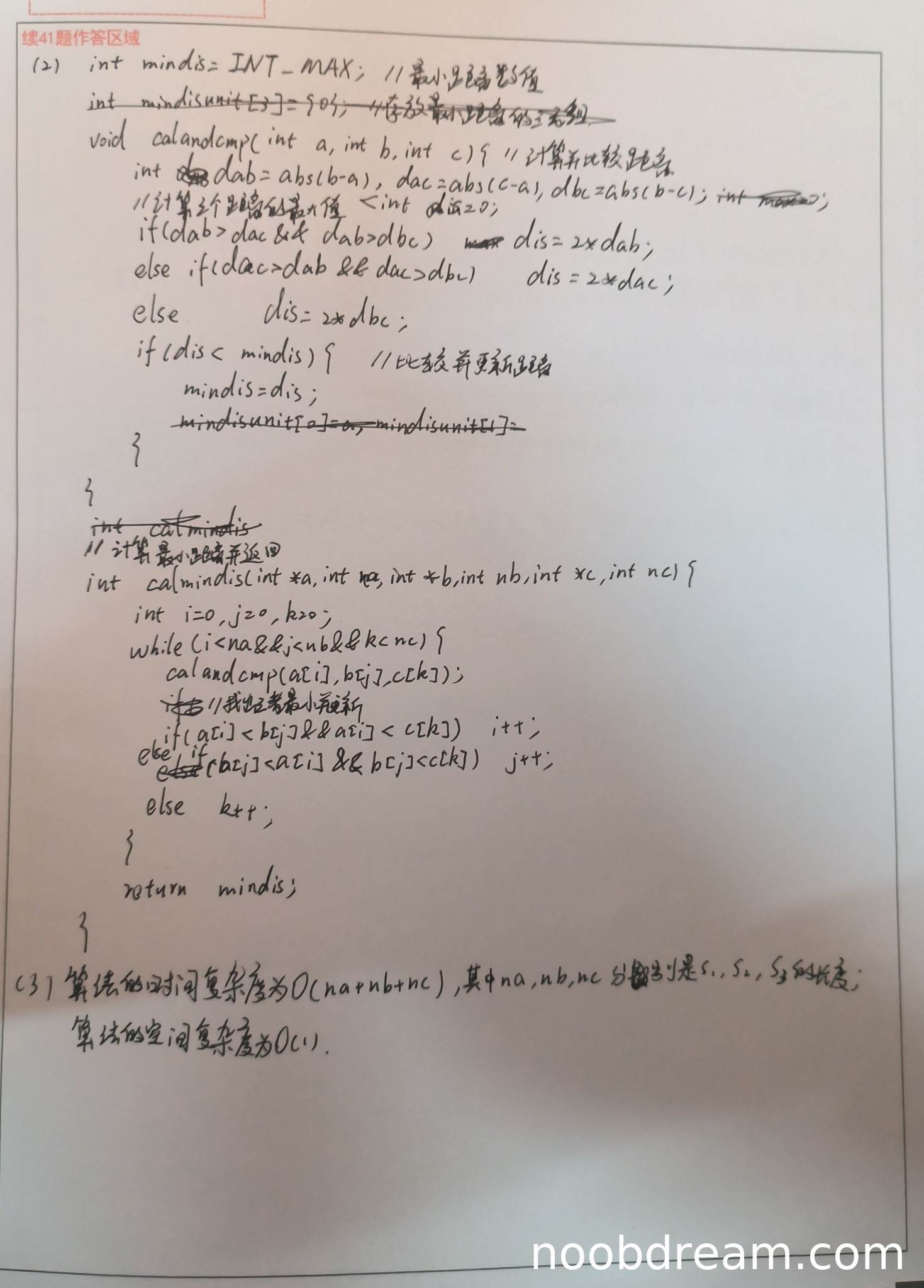- 但距离计算函数calandcmp中存在逻辑错误:题目要求的距离公式是D=|a-b|+|b-c|+|c-a|,而学生代码中使用了错误公式dis = 2*max(|a-b|,|a-c|,|b-c|)。这个公式在一般情况下不等于题目要求的距离,会导致计算结果错误。(-2分)