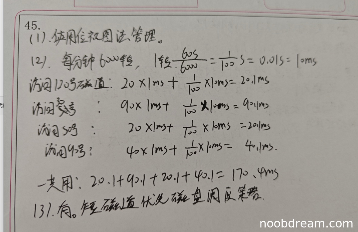 考虑到学生正确计算了寻道距离(170磁道×1ms=170ms),但在旋转时间和读取时间计算上有误,给1分。