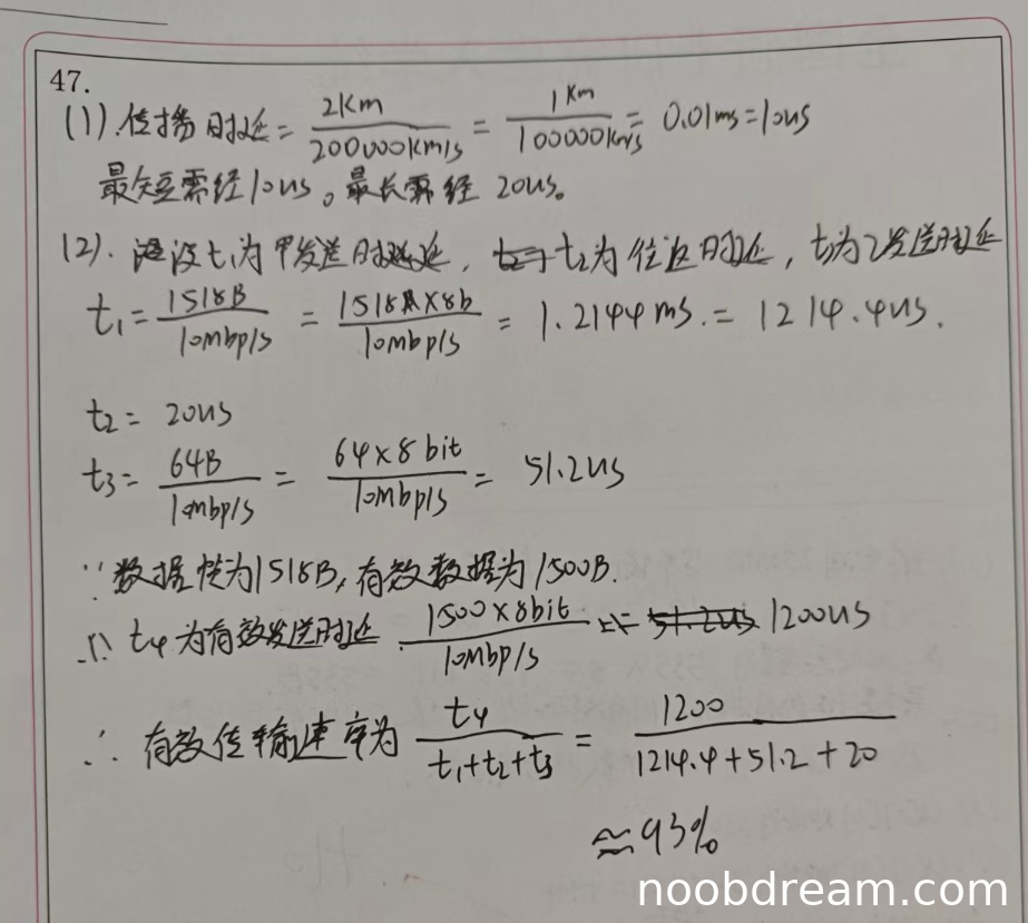 学生正确计算了数据帧发送时延t₁=1.2144ms,确认帧发送时延t₃=51.2μs,往返传播时延t₂=20μs。但在计算有效数据传输速率时存在以下问题: