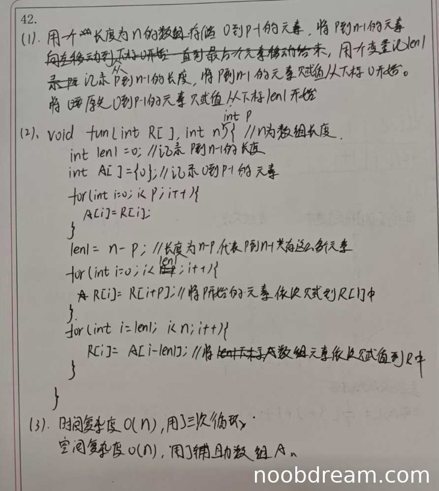 理由:学生的设计思想与标准答案中的"借助辅助数组"方法一致,即使用辅助数组存储前p个元素,然后将后n-p个元素左移,最后将辅助数组中的元素放回数组后部。思路正确且描述清晰。