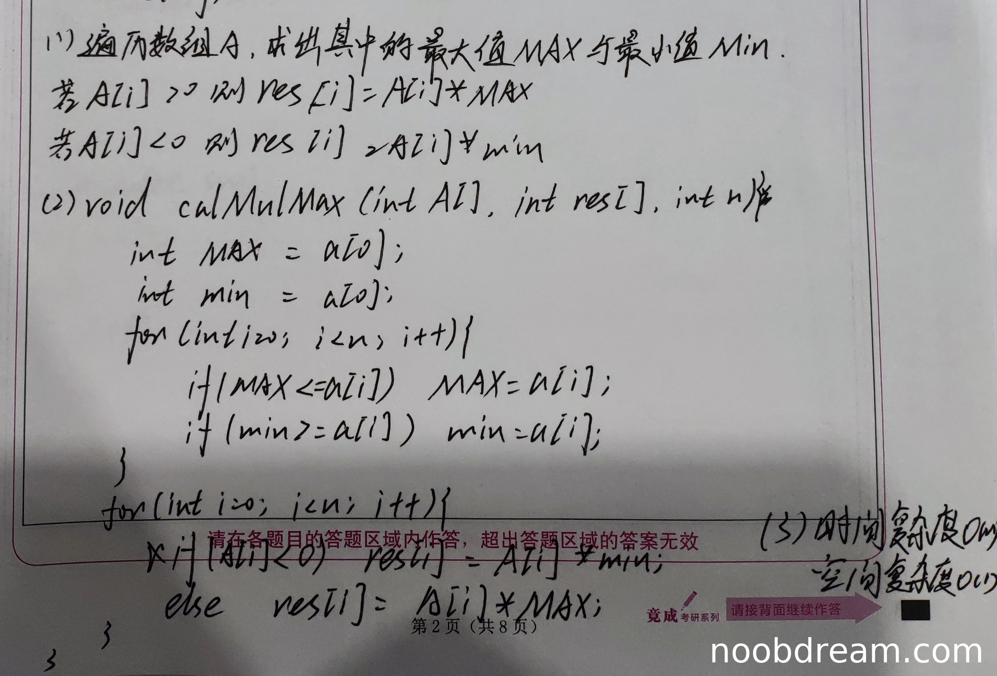 得0分。代码实现基于错误的设计思想,使用全局最大值和最小值,没有考虑j≥i的限制。虽然在某些测试用例下结果正确,但逻辑错误,无法保证在所有情况下正确。例如,如果数组为{10,1,2},学生算法MAX=10,min=1,res[0]=10*10=100(正确,因为j=0时乘积最大),res[1]=1*10=1...