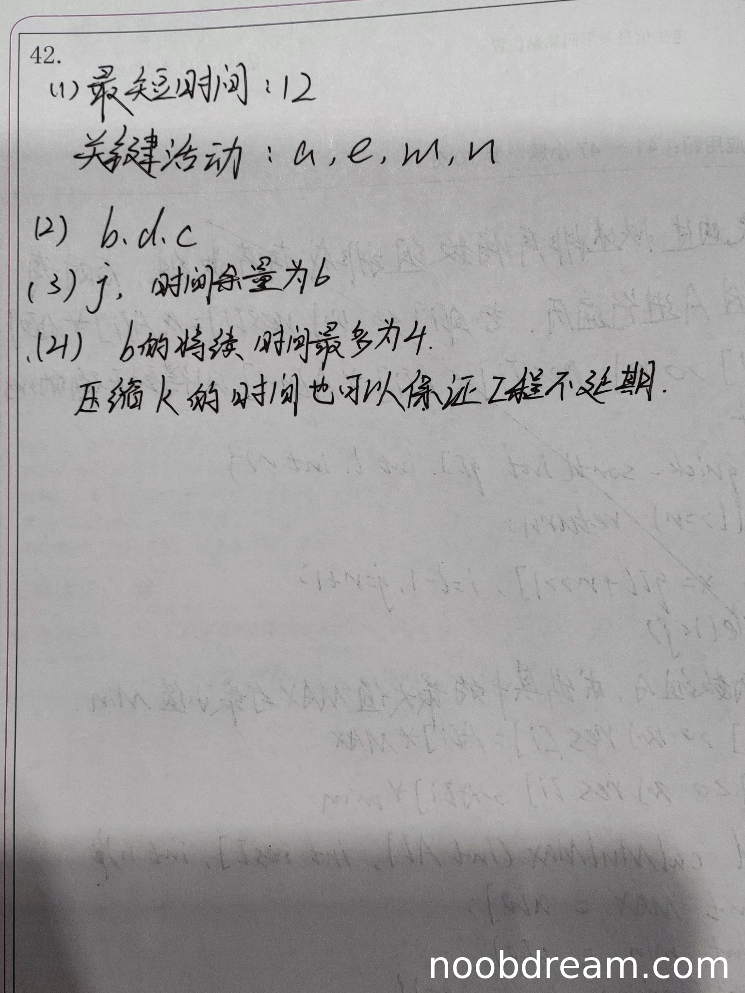 学生答案:最短时间12,关键活动a、e、m、n。与标准答案完全一致。得3分。