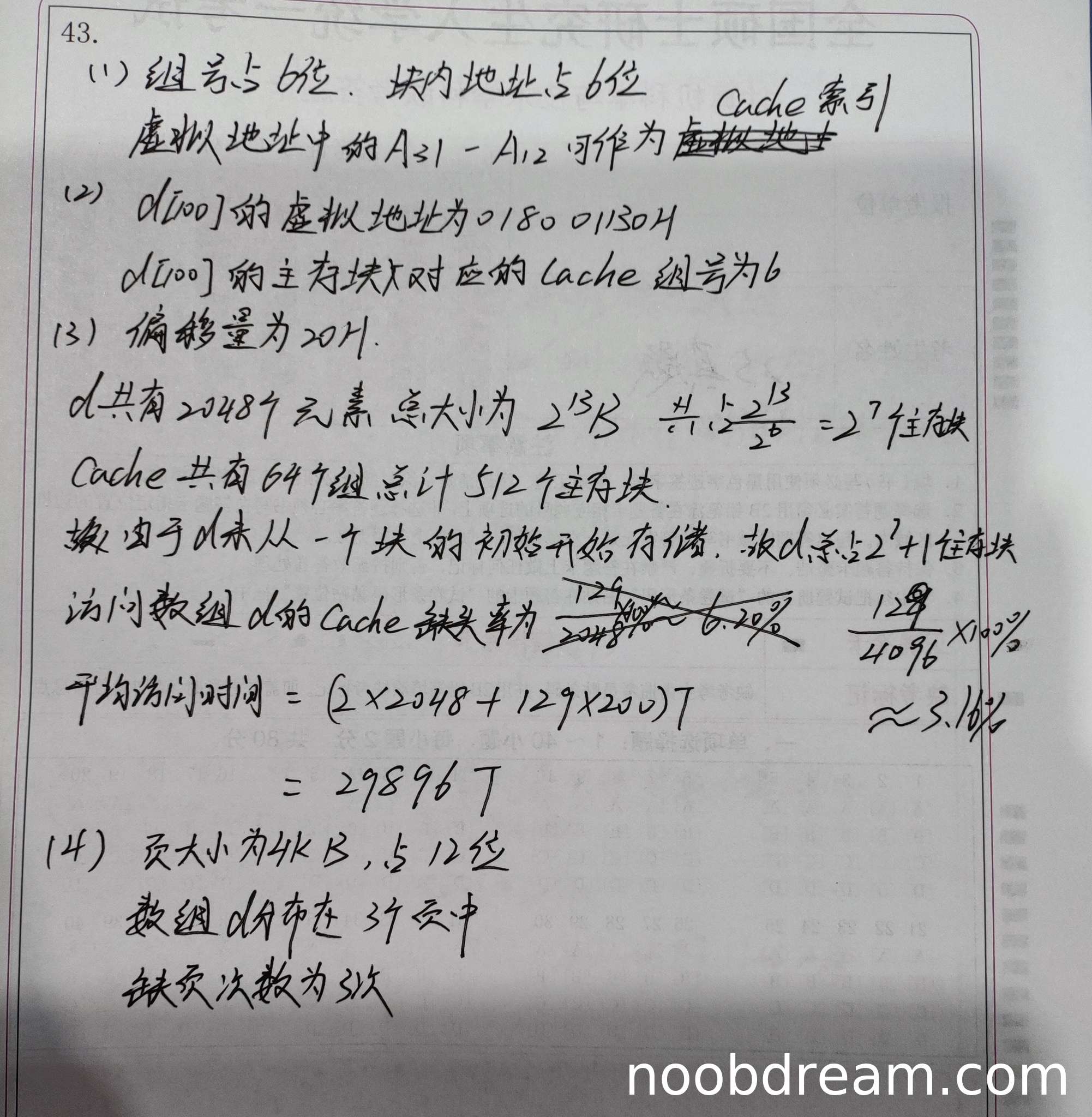 理由: - 偏移量20H正确(得1分) - 主存块数129正确(得1分) - 缺失率计算:第一次识别给出两个结果(6.20%和3.16%),第二次识别3.15%正确(得1分) - 平均访问时间计算错误:学生用(2×2048+129×200)T计算,这是总时间而非平均访问时间,正确应为2+200p(得0分) - 缺失率分母:学生正确使用4096作为总访存次数(2048次读+2048次写)