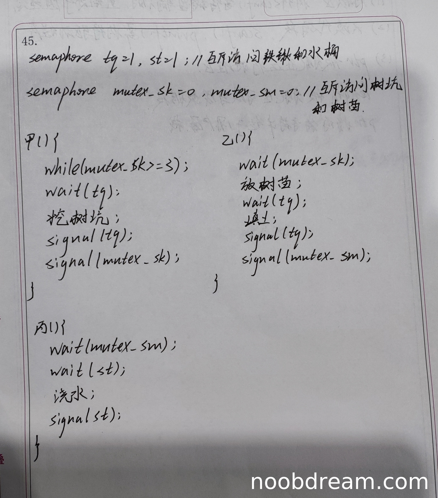 理由:乙的流程基本正确(等待树坑、放树苗、等待铁锹、填土),但信号量的使用逻辑错误。mutex_sk初值为0,乙一开始就会阻塞,无法执行。signal(mutex_sm)操作正确。扣1分。