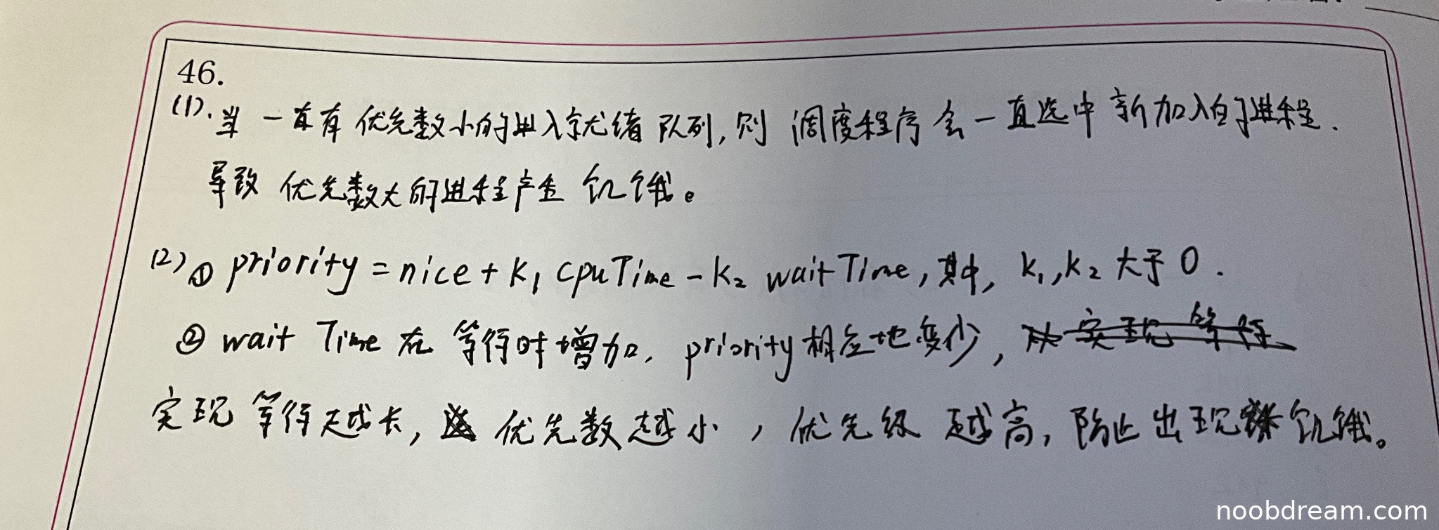 学生给出了正确的动态优先数计算公式:priority = nice + k₁ cpuTime - k₂ waitTime,其中k₁, k₂大于0。这包含了标准答案要求的所有要素:nice作为基础、cpuTime增大优先数、waitTime减小优先数。同时正确说明了waitTime的作用:等待时间越长,优先数越小,优先级越高,防止饥饿。完全符合标准答案要求。得4分。