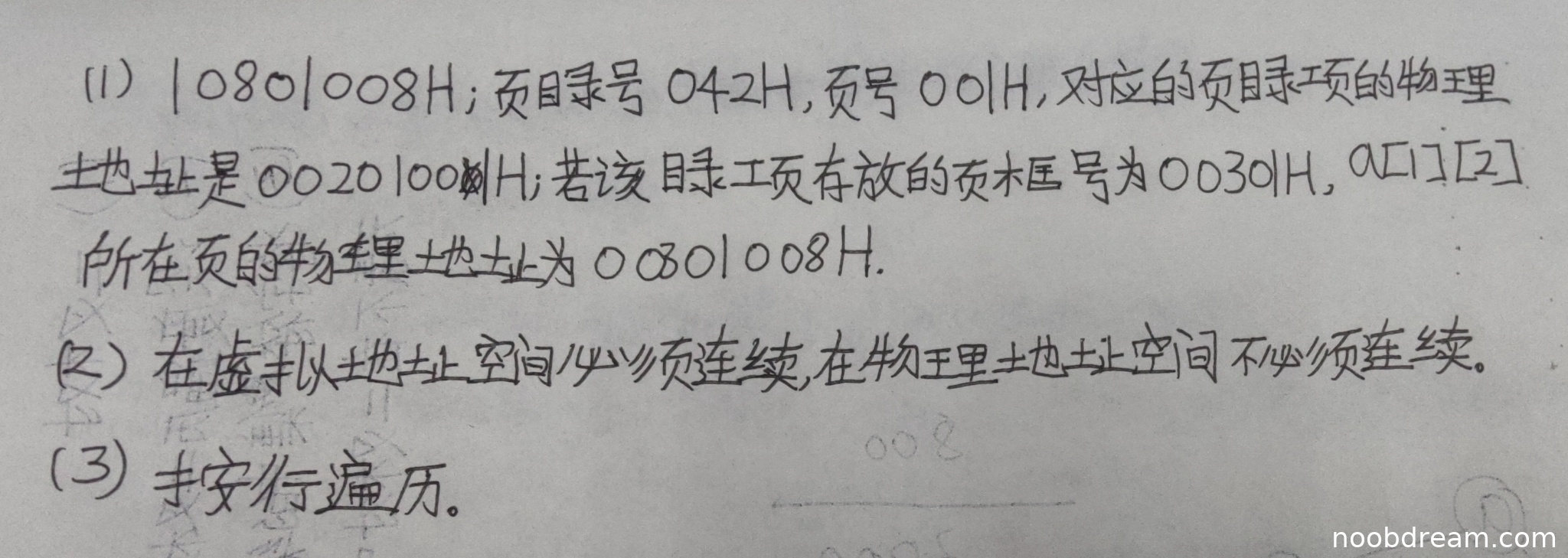 - 页目录项的物理地址第一次识别为0020100H(缺少最后一位),第二次识别为00201008H正确,根据禁止扣分规则中“相似字符识别错误”和“两次识别有一次正确不扣分”,得1分。