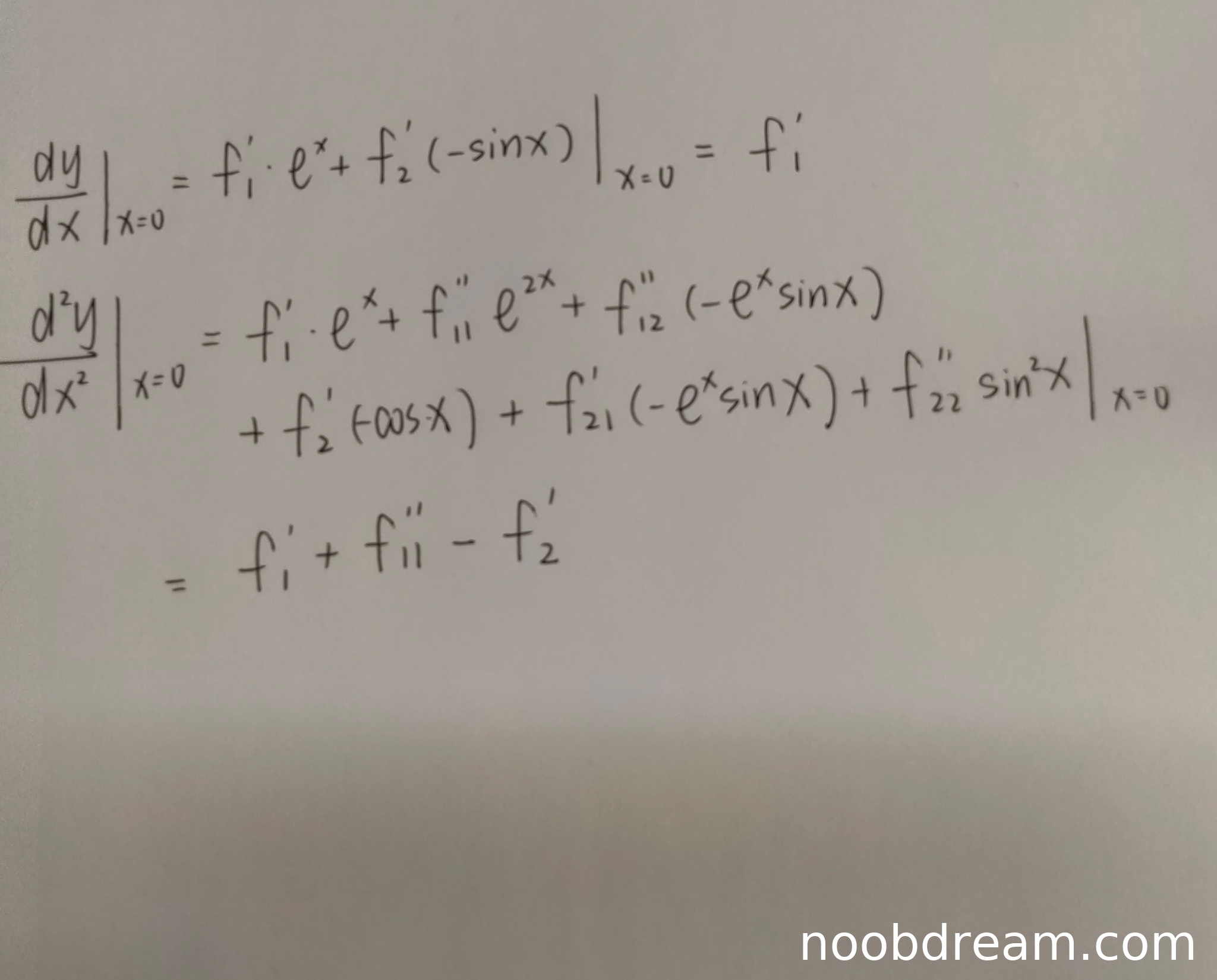 然而,仔细检查学生的计算过程,发现在二阶导数的展开中,对\((f_1'\cdot e^{x})^\prime\)的求导结果是\(f_{11}''e^{2x}+f_{12}''(-e^{x}\sin x)+f_1'e^{x}\),这是正确的。对\((f_2'(-\sin x))^\prime\)的求导结果是\(f_2'(-\cos x)+f_{21}''(-e^{x}\sin x)+f_{22}''\sin^{2}x\),这也是正确的。最终代入x=0得到\(f_1'+f_{11}''-f_2'\),这与标准答案一致。