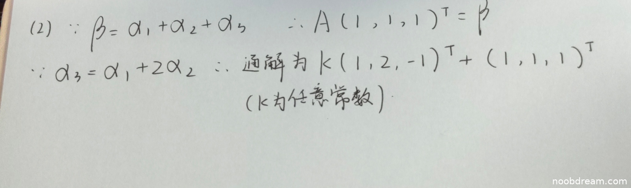 第(II)问中,学生正确识别出特解为(1,1,1)ᵀ,基础解系为(1,2,-1)ᵀ,并给出了正确的通解形式k(1,2,-1)ᵀ+(1,1,1)ᵀ。虽然未详细说明基础解系的推导过程,但核心逻辑完全正确。考虑到本题满分11分,其中第(I)问和第(II)问的分值分配通常为第(I)问4分,第(II)问7分。由于学生第(II)问解答完整正确,给予满分7分。