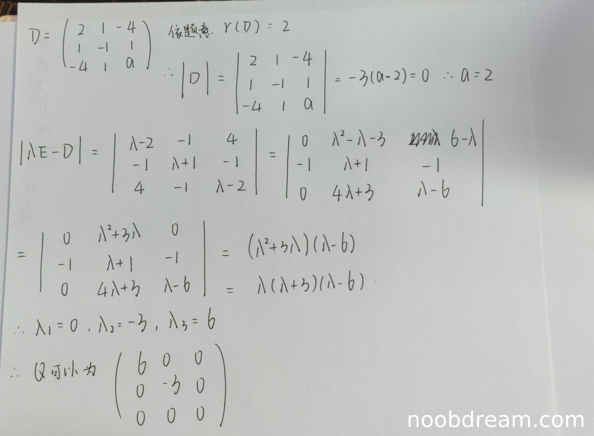 学生只给出了相似对角矩阵,但题目要求的是正交矩阵Q。学生没有计算特征向量,也没有进行正交化和单位化,没有给出正交矩阵Q。这是严重的逻辑错误,扣4分。得0分。