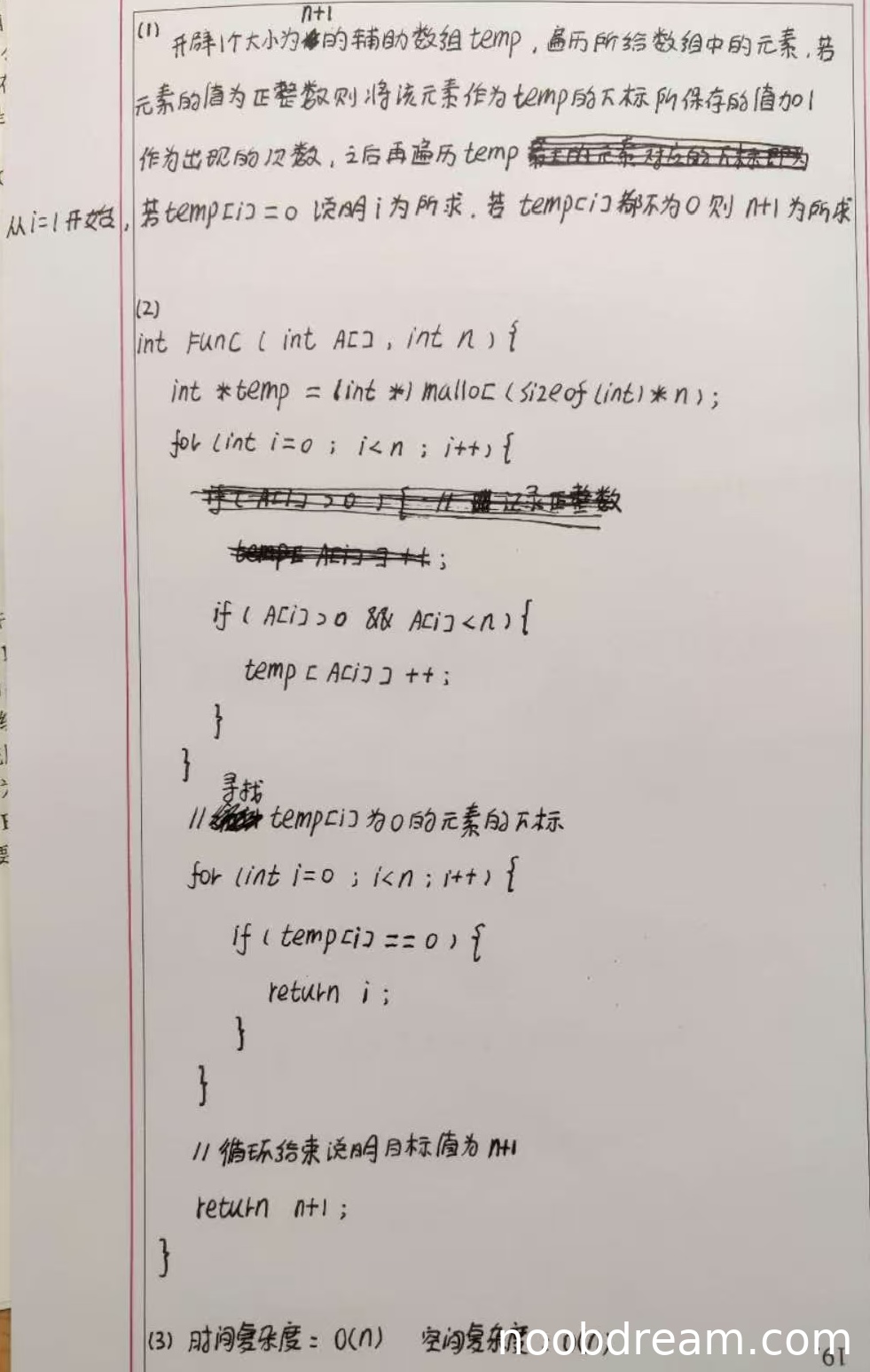 学生答案的基本设计思想是使用辅助数组记录正整数出现的次数,然后遍历辅助数组找到第一个未出现的正整数。思路正确,与标准答案的哈希思想类似,但存在细节问题:未明确说明从1开始检查(虽然第二次识别补充了从i=1开始,但代码实现中仍从0开始遍历)。考虑到思路核心正确,扣1分。得分:2分