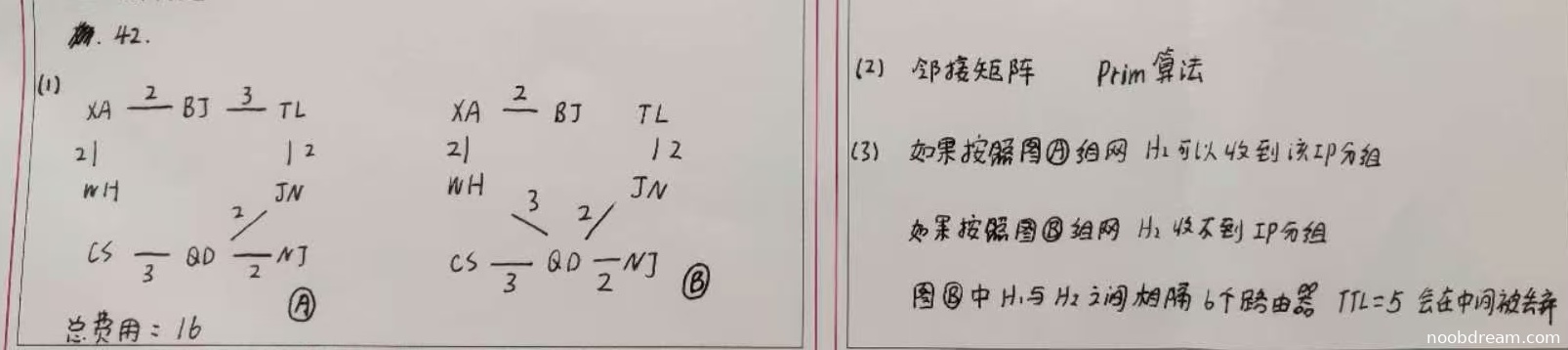 学生给出了两种最小生成树方案(图A和图B),并正确计算总费用为16,与标准答案一致。虽然图A和图B的具体边连接方式与标准答案的方案一和方案二略有不同,但总费用相同且均构成最小生成树,因此思路正确。得4分。