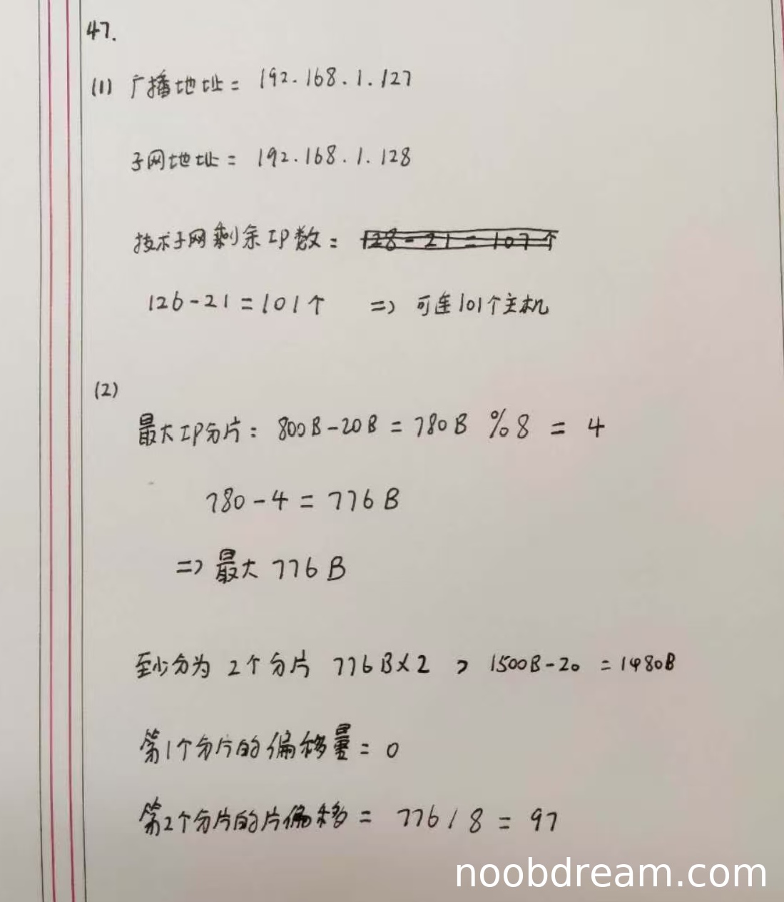 第一问:学生计算最大IP分片封装数据为776B,与标准答案一致,得1分。
