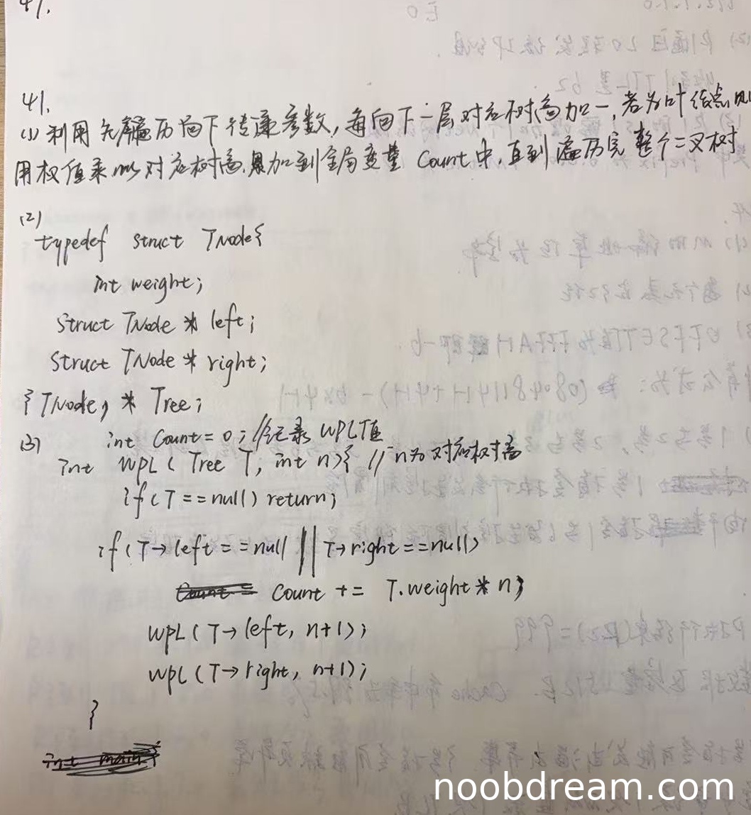理由:学生的基本设计思想正确,明确提出了使用先序遍历,通过向下传递深度参数,在叶子节点处计算权值与深度的乘积并累加。这与标准答案中基于先序遍历的思想完全一致。