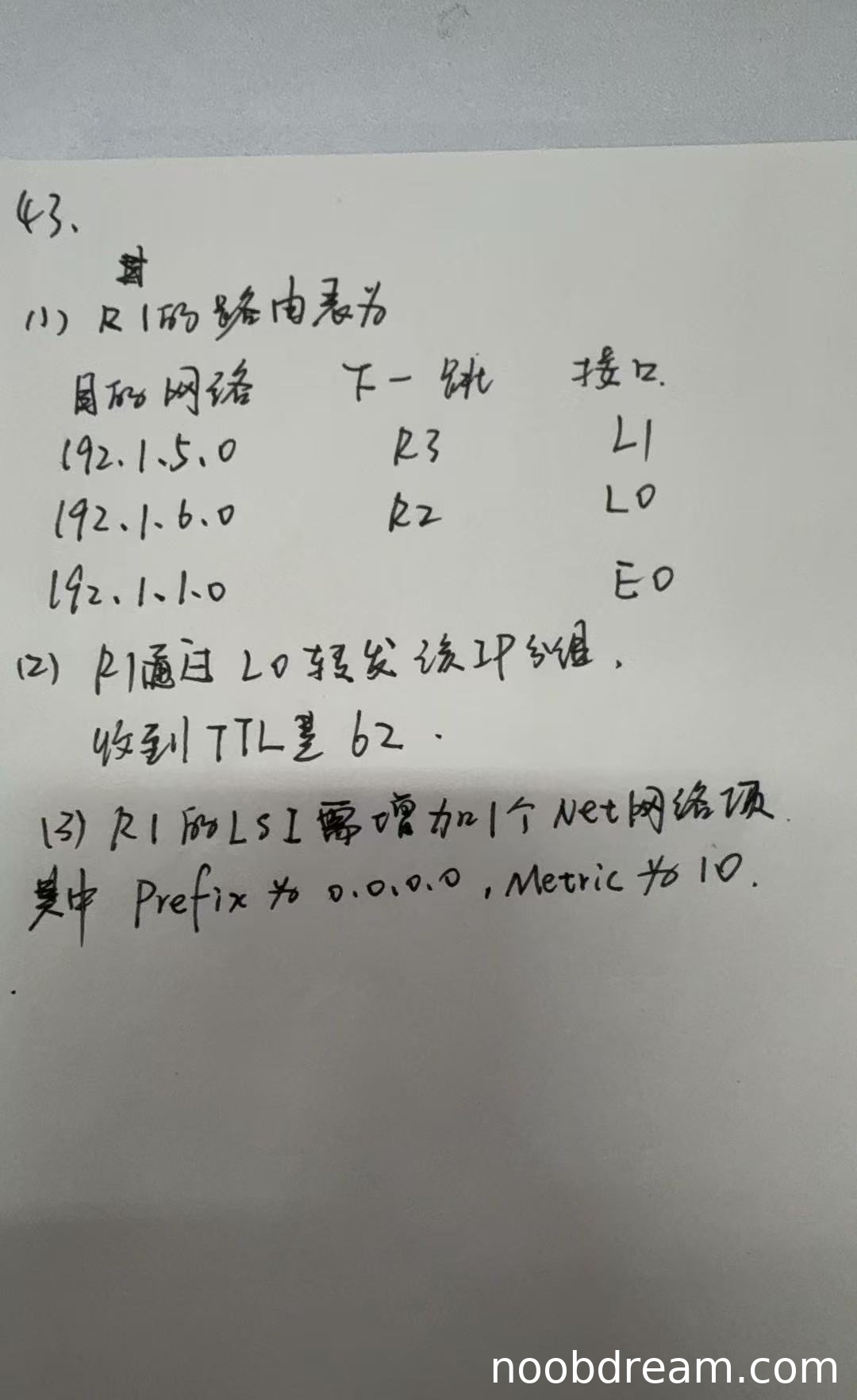 学生答案中给出了三个路由项:192.1.5.0/24(下一跳R3,接口L1)、192.1.6.0/24(下一跳R2,接口L0)、192.1.1.0/24(接口E0)。标准答案要求将192.1.6.0/24和192.1.7.0/24聚合为192.1.6.0/23,但学生答案中只列出了192.1.6.0/24,没有进行聚合,导致路由项不是最少。每个路由项2分,由于缺少聚合,192.1.6.0/24这一项不能给满分,但其他两项正确。因此酌情扣1分,得5分。