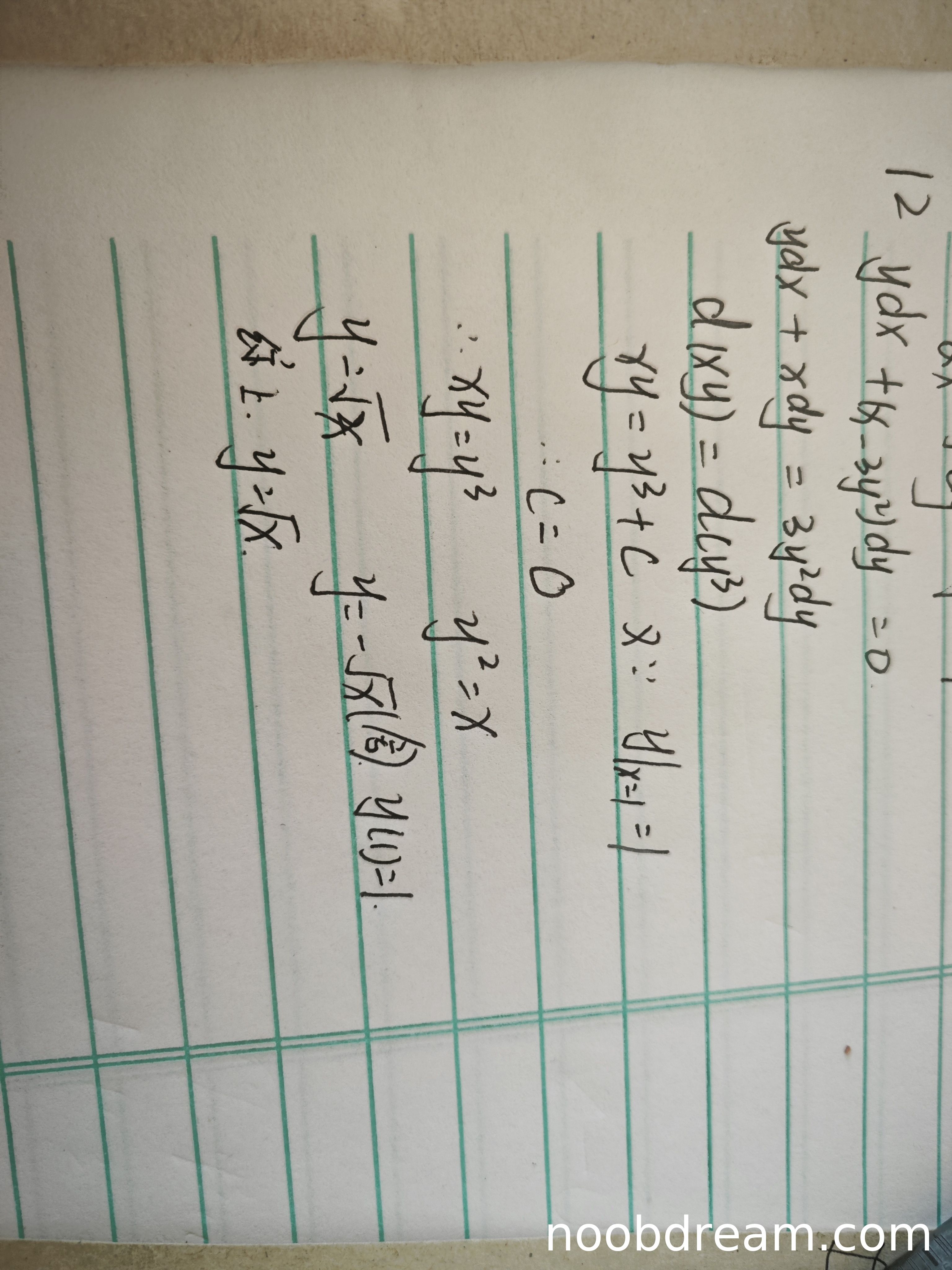 第1次识别结果:学生通过将原方程变形为恰当微分方程,正确得到 \(d(xy) = d(y^3/3)\),积分后得到 \(xy = y^3/3 + C\),代入初始条件 \(x=1, y=1\) 解得 \(C=0\),最终得到 \(y = \sqrt{x}\)。此过程逻辑正确,与标准答案一致,且满足初始条件。虽然最后多写了 \(y = -\sqrt{x}(3/x)^{1/3}\),但明确说明舍去,不影响核心答案。因此得4分。