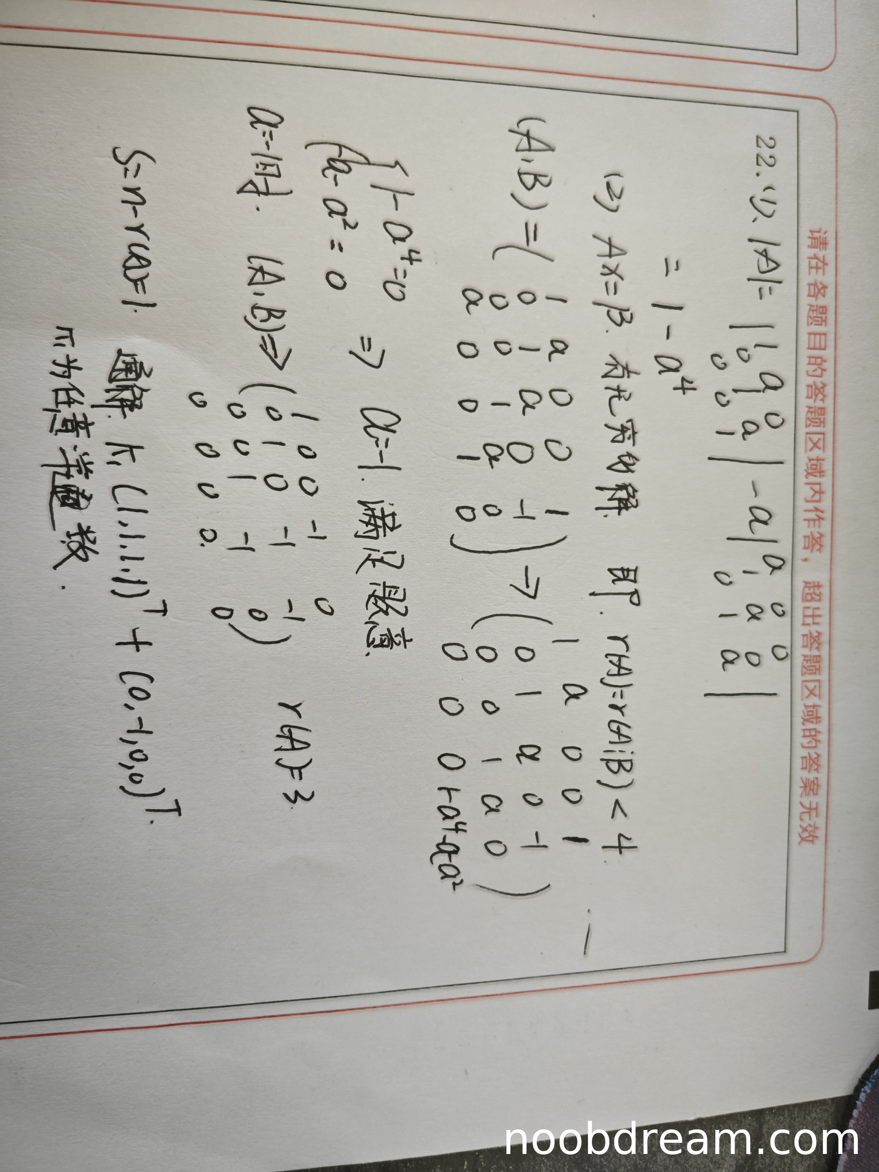 学生第一问没有给出具体计算结果,只写了一个错误的行列式表达式,没有得出|A|=1-a⁴的结果。因此该部分得0分。