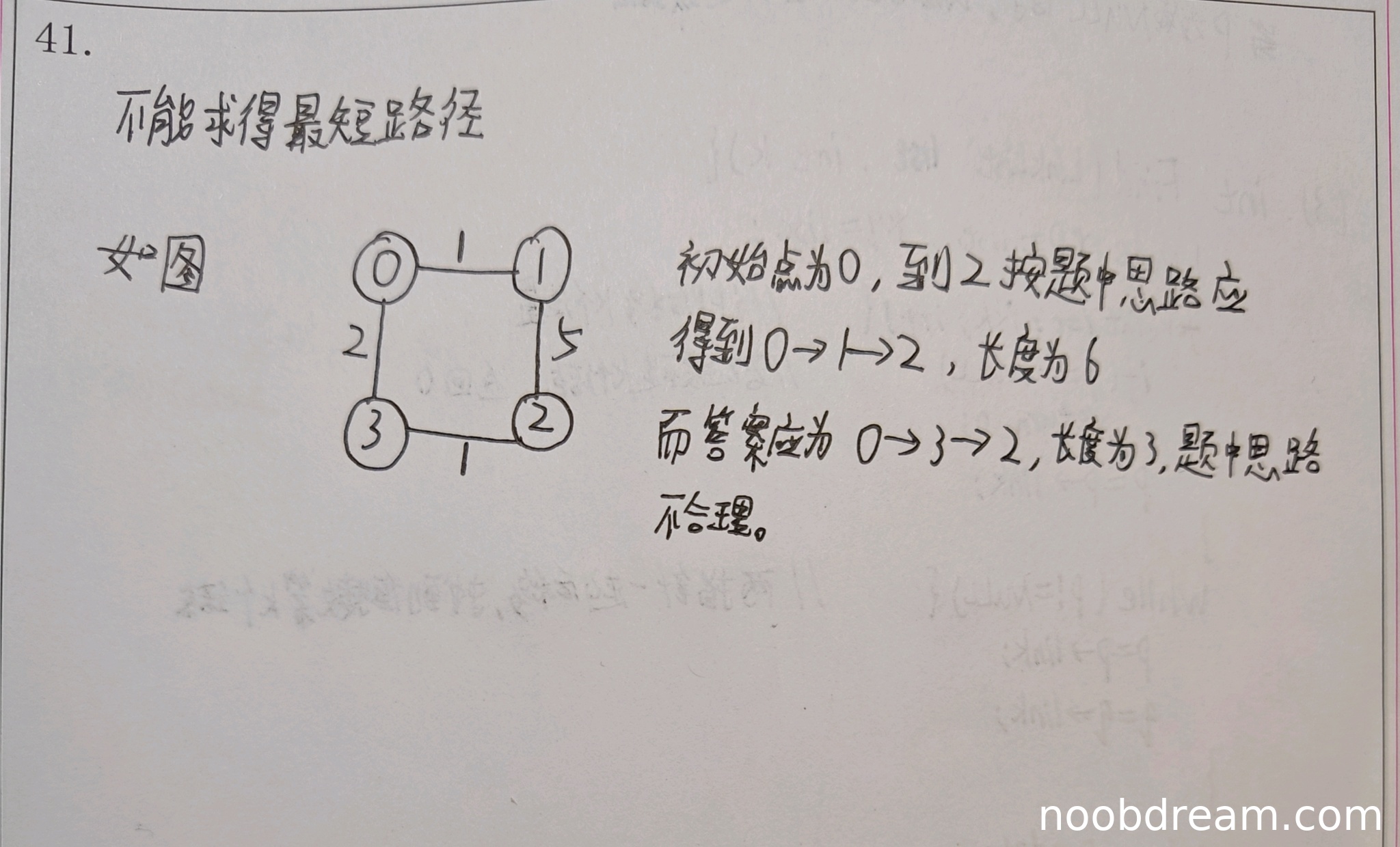 学生正确指出该方法不能求得最短路径,并给出了具体的反例。学生描述了一个图结构,其中初始顶点为0,目标顶点为2,按照题目方法得到路径0→1→2(长度为6),而实际最短路径是0→3→2(长度为3)。这与标准答案中给出的反例结构相似(都是通过选择局部最近顶点导致错过全局最短路径),虽然顶点编号不同,但逻辑本质一致。因此回答正确。