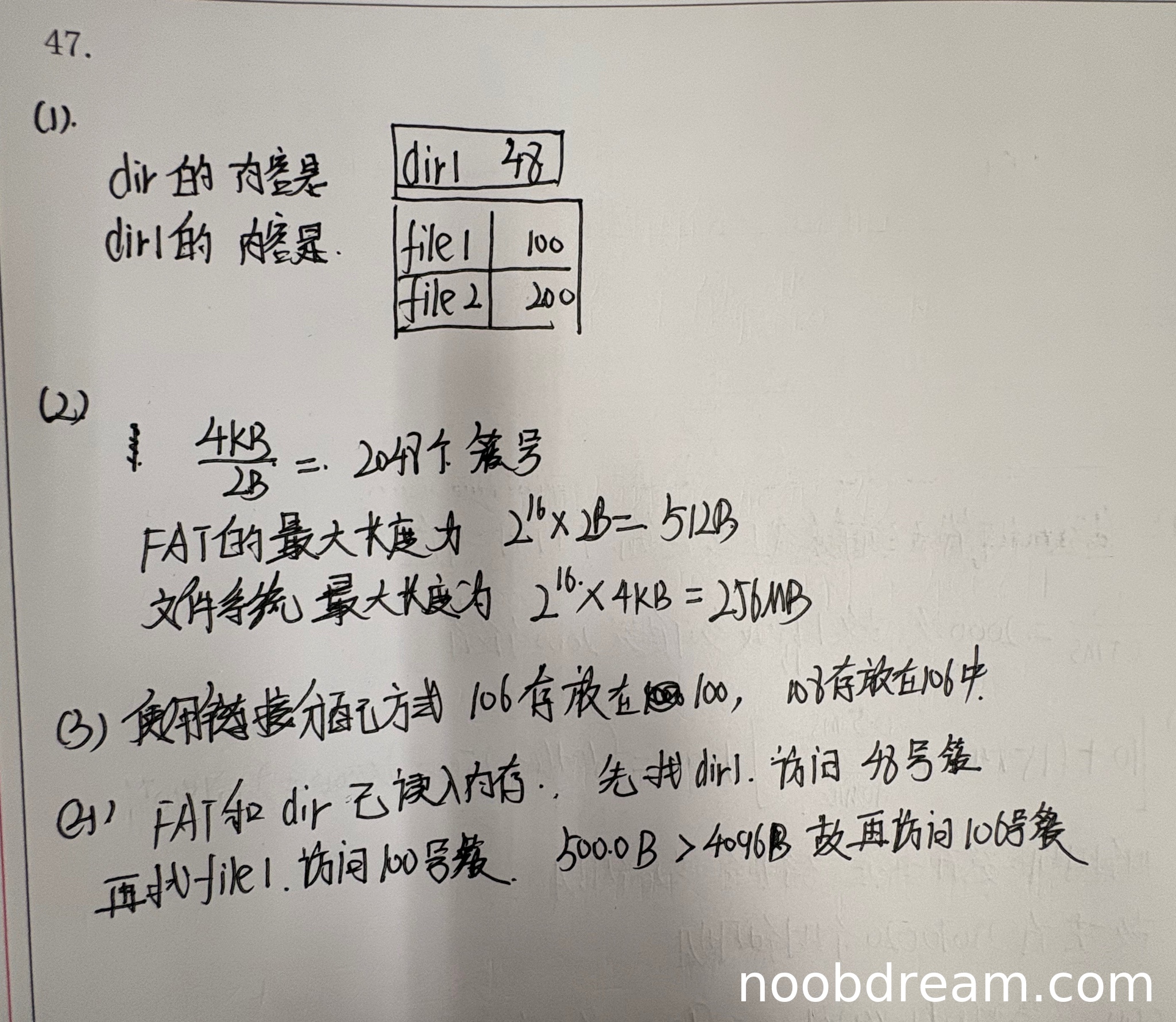 学生答案中计算FAT最大长度时得出512B,这是错误的。正确计算应为2^16×2B=128KB。但计算文件最大长度256MB是正确的。由于FAT长度计算错误,扣1分。得1分。