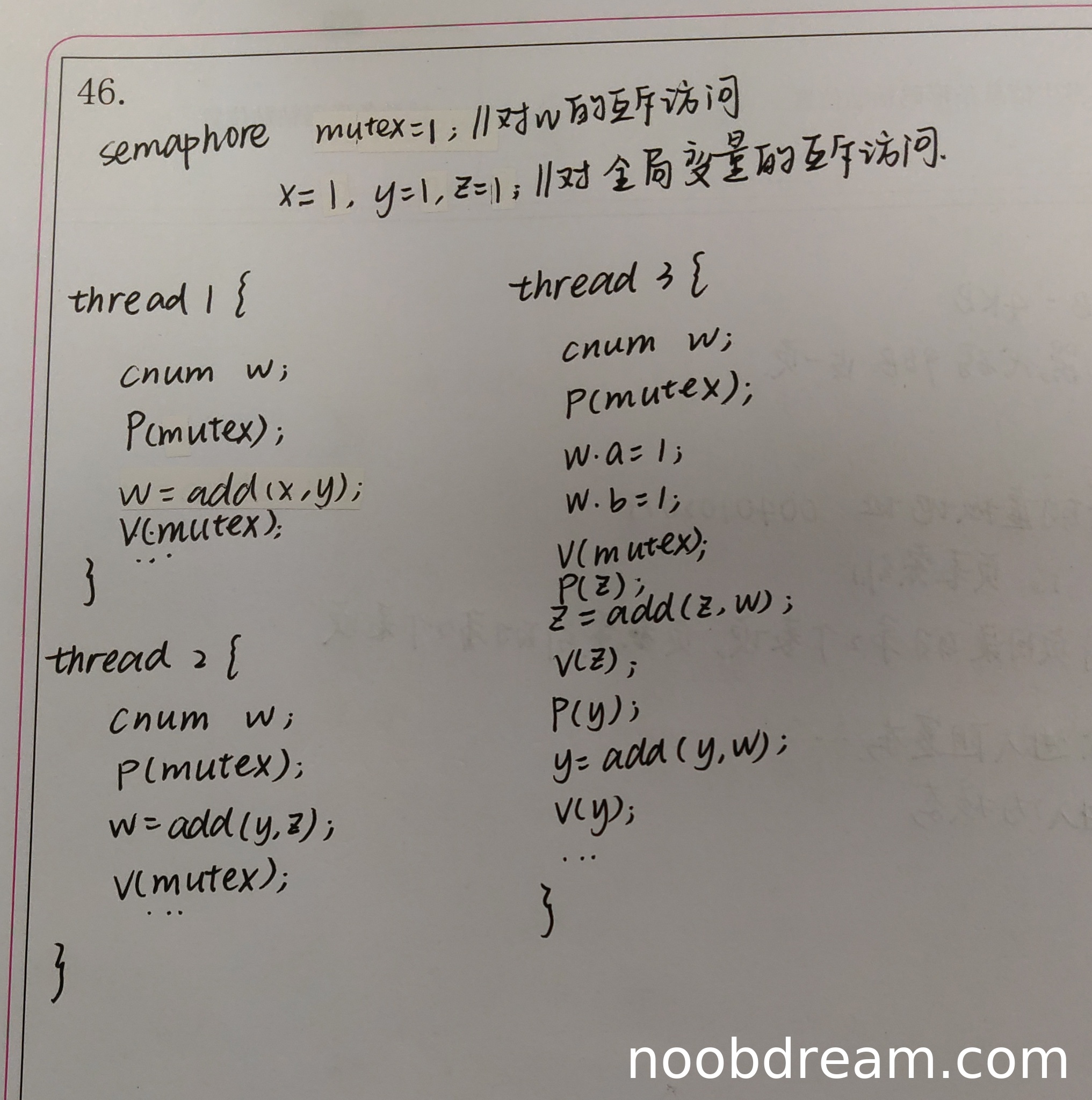 thread3中局部变量w的初始化使用了mutex保护,这是不必要的。对z和y的修改尝试使用P(z)、P(y)等操作,但z和y是变量而非信号量,语法错误。没有正确处理对y和z的互斥访问,特别是对y的访问需要与thread1和thread2都互斥。存在严重逻辑错误,扣3分。