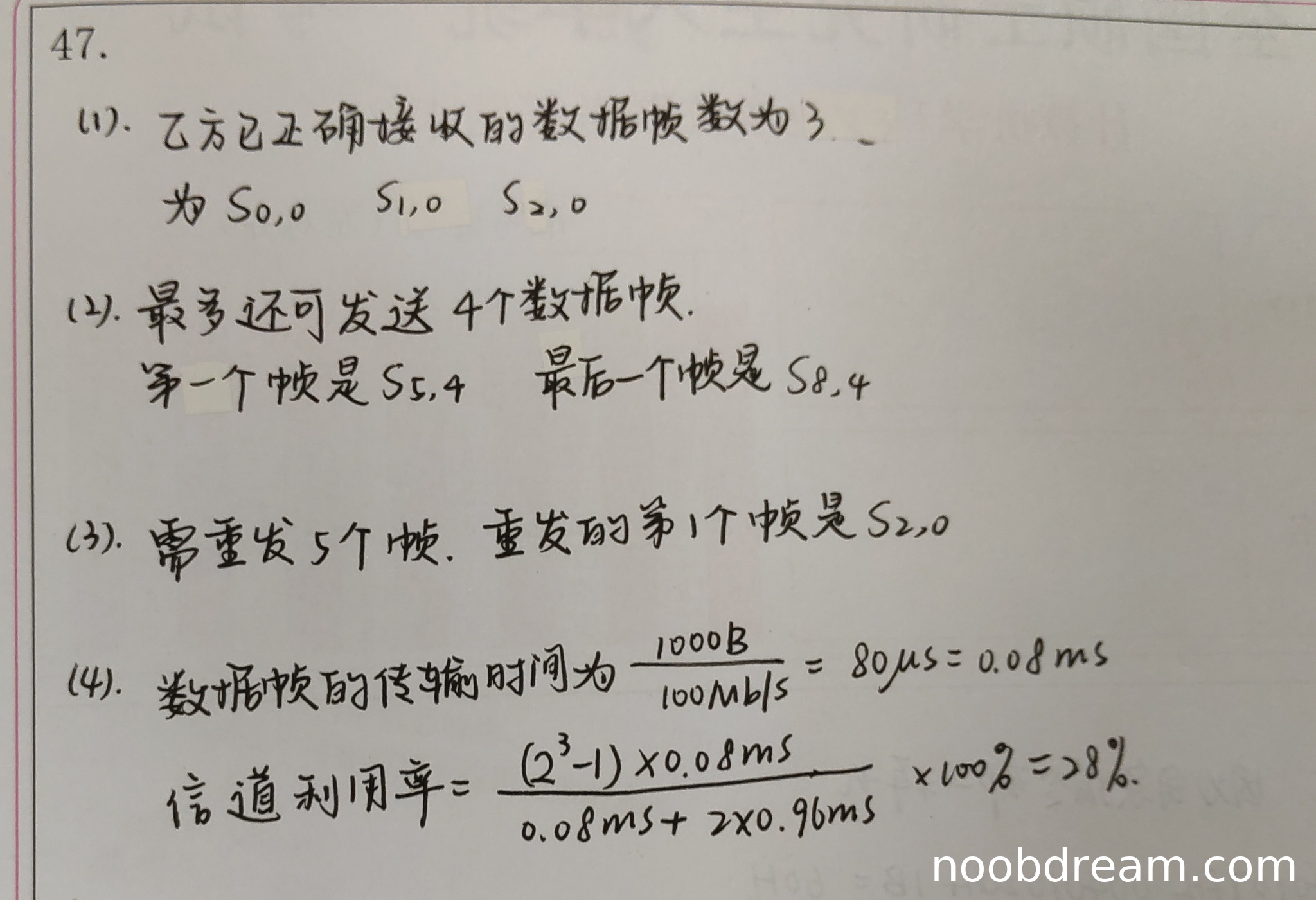 学生计算的数据帧传输时间正确(0.08ms),但信道利用率计算公式分母错误(误加了2倍传输时间),导致结果28%错误。标准答案为50%。核心计算逻辑错误,扣1分。得0分。