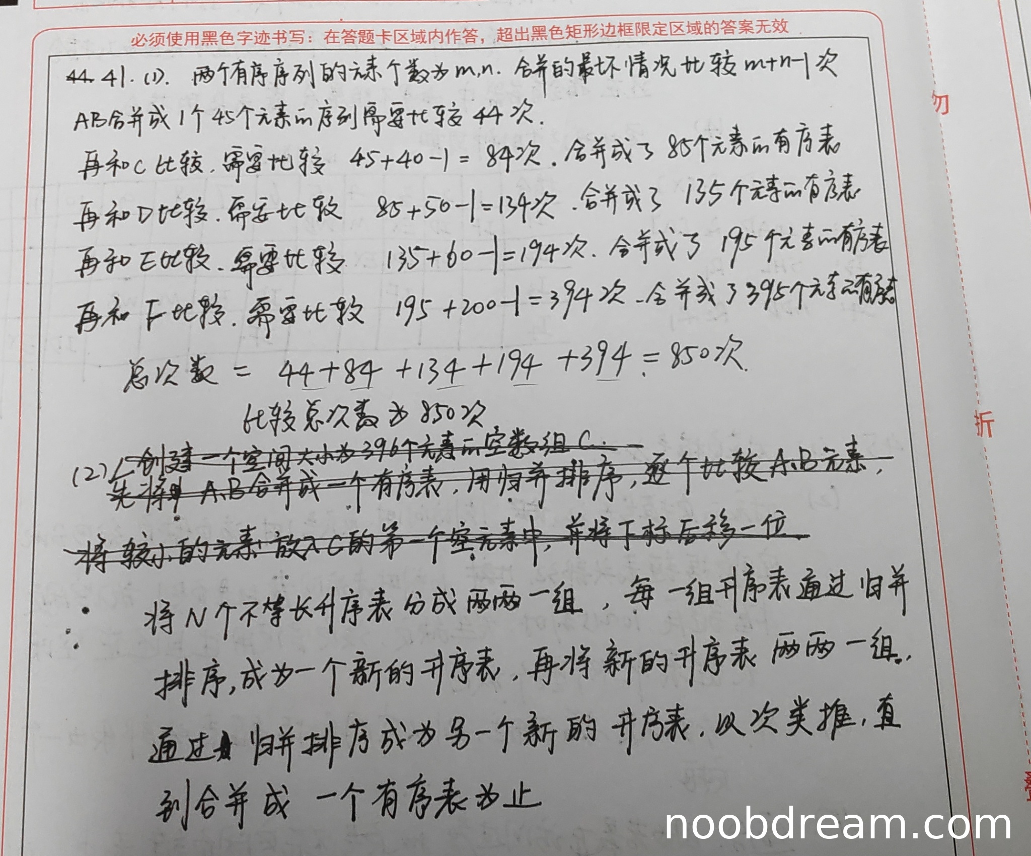 学生描述的策略是“将N个不等长升序表分成两两一组,每一组升序表通过归并排序,成为一个新的升序表,再将新的升序表两两一组,通过归并排序成为另一个新的升序表,以此类推,直到合并成一个有序表为止”。这是一种两两合并的策略,但没有说明如何选择合并顺序(例如,是否优先合并较短的表)。标准答案强调应借用哈夫曼树思想,依次选择最短的两个表合并。学生的策略虽然能完成合并,但未体现最优合并顺序,因此根据评分说明,采用其他策略但能完成合并的给2分。本部分得分2分。