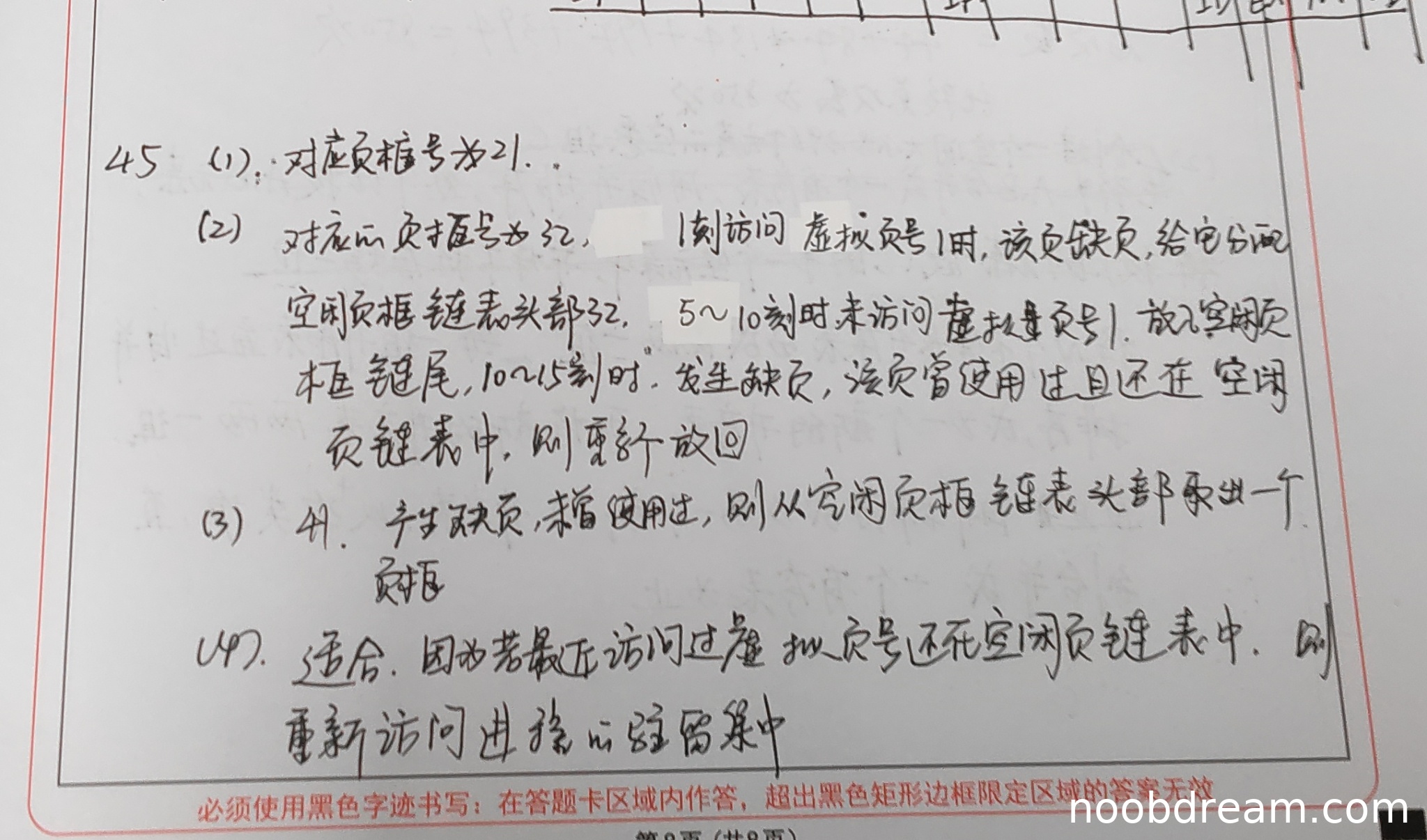 学生两次识别结果均回答页框号为32,理由中正确描述了页1在第二轮扫描(5-10时刻)未被访问而被回收,并在11时刻缺页时因仍在空闲链表中而被重新放回驻留集的过程。理由与标准答案一致。得2分。