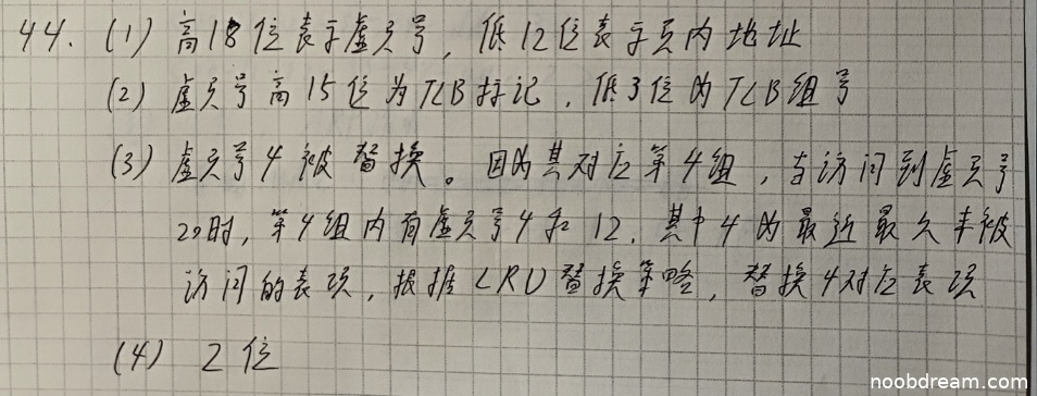 学生回答:虚页号高15位为TLB标记,低3位为TLB组号。第一次识别中"TCB"应为"TLB"的误写,第二次识别正确为"TLB",根据禁止扣分规则第1条,不扣分。答案与标准答案一致,得2分。