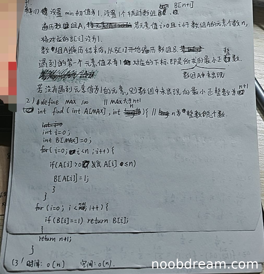 学生答案的基本设计思想正确:使用辅助数组B来标记出现过的正整数,然后遍历B数组找到第一个未被标记的位置。这种方法与标准答案的"负号标记法"虽然实现方式不同,但都是利用数组下标作为哈希键的思想,属于正确的解题思路。因此得3分。