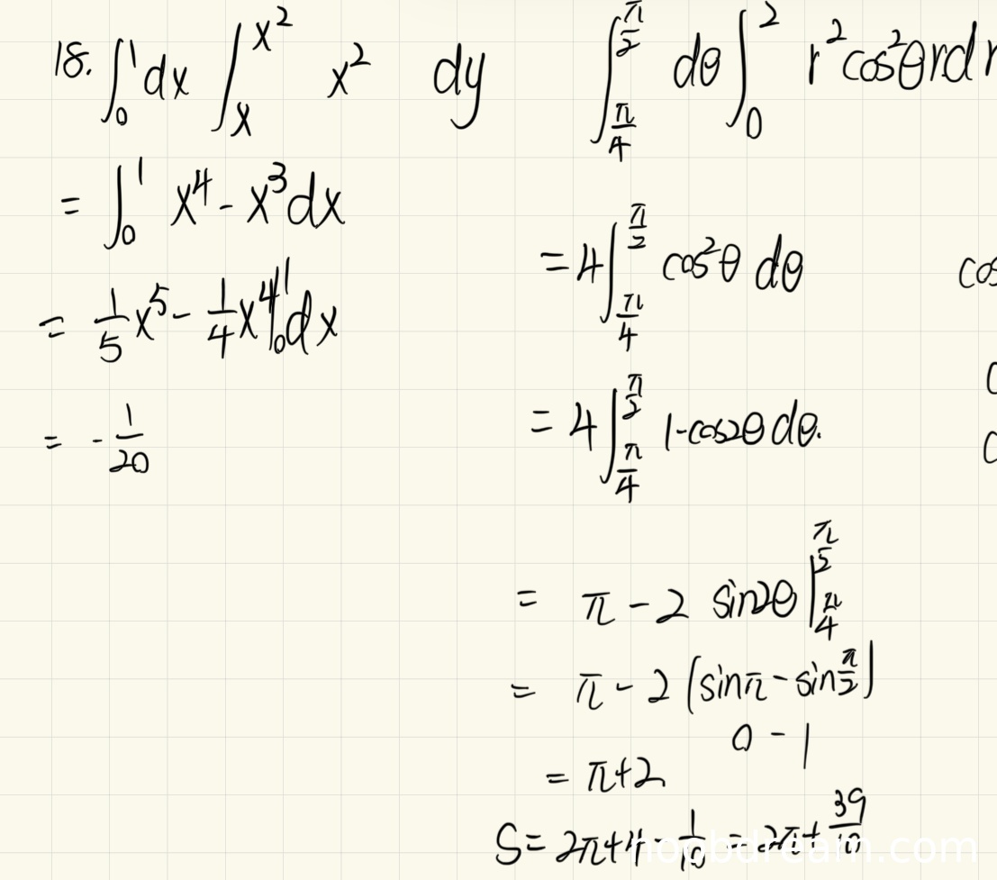 - 最终结果计算错误:将两个错误的积分结果相加得到2π+39/10,与正确答案π/4-2/5相差甚远。