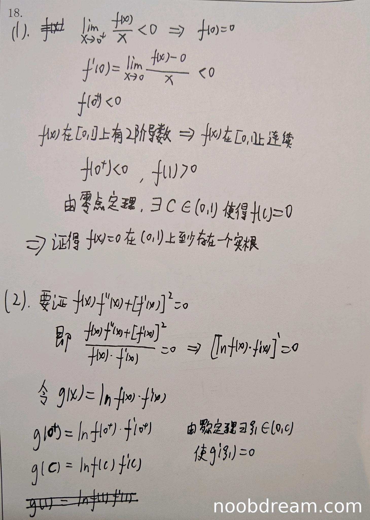 不过核心逻辑(存在点使f(x)<0,再结合f(1)>0用零点定理)是正确的。考虑到证明的主要步骤完整,扣1分。