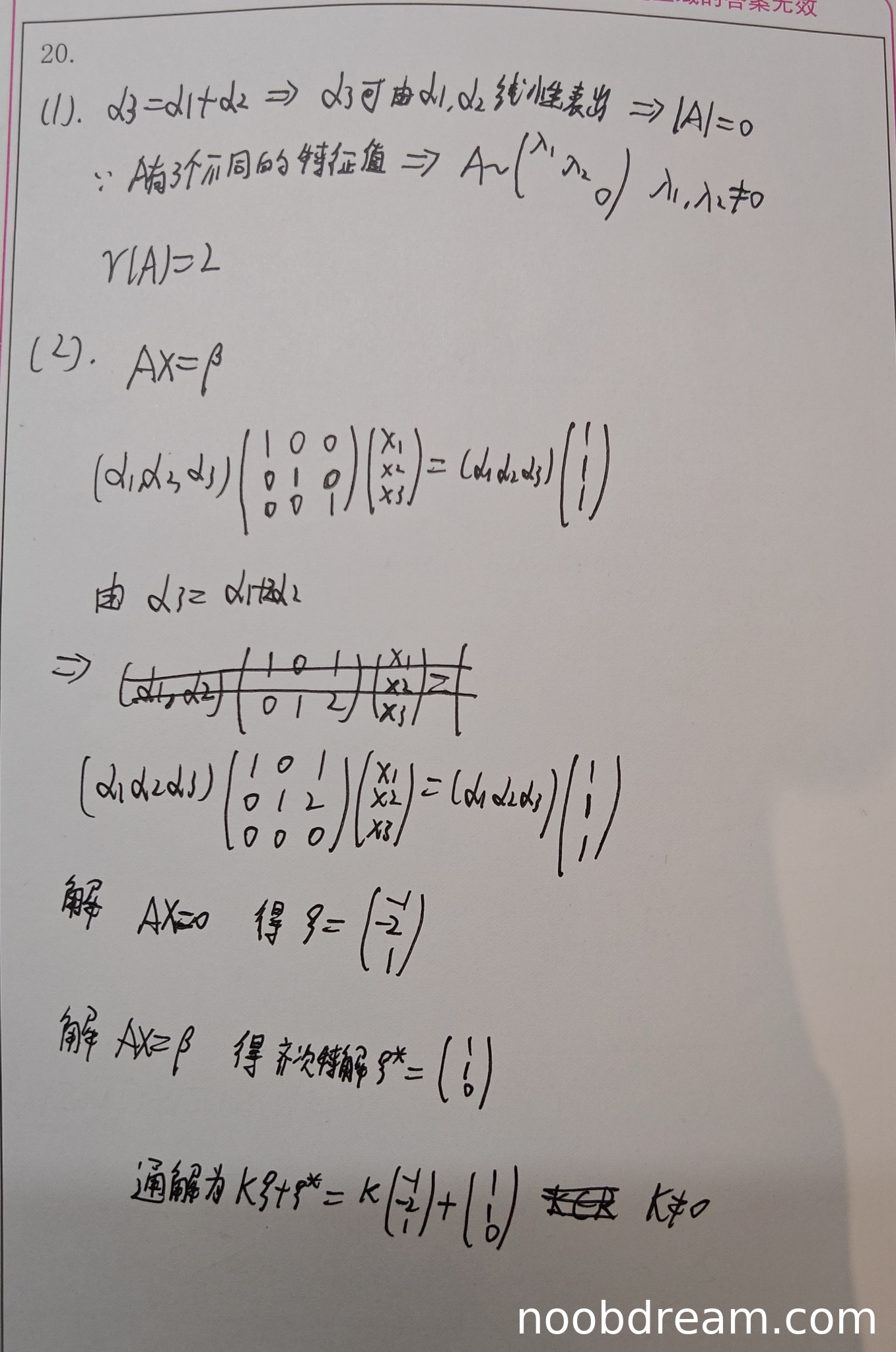 第1次识别中,学生将条件误写为α₃=α₁+α₂(应为α₁+2α₂),但后续推理逻辑正确:由线性相关得|A|=0,由三个不同特征值得A可相似对角化且秩≥2,结合得r(A)=2。误写未影响核心逻辑,扣1分。第2次识别同样误写条件,但推理正确。综合两次识别,核心逻辑正确,但条件误写,扣1分。得4分。