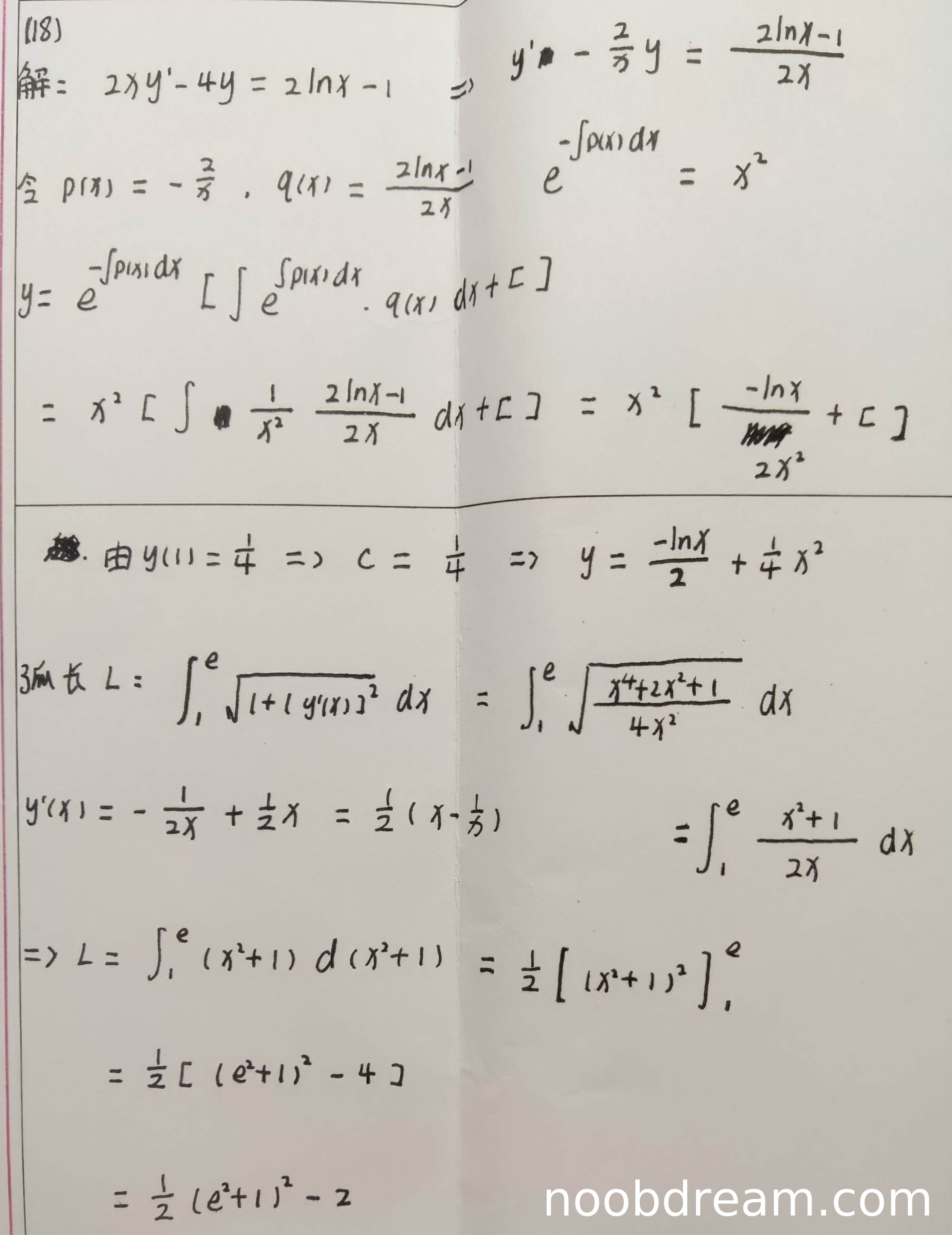 学生正确计算了导数 \(y'\),正确写出弧长公式并化简被积函数为 \(\frac{x^2+1}{2x}\)。在计算积分时,第一次识别结果出现了严重错误:错误地将 \(\int_{1}^{e} \frac{x^2+1}{2x} dx\) 写成 \(\int_{1}^{e} (x^2+1) d(x^2+1)\),这是概念性错误,导致最终结果错误。第二次识别结果正确计算了积分 \(\frac{1}{2}\int_{1}^{e}(x+\frac{1}{x})dx\),得到正确结果 \(\frac{1}{4}(e^2+1)\)。但由于第一次识别存在逻辑错误,且最终给出的答案中包含了错误结果,根据评分要求"对于有逻辑错误的答案不要给满分",扣2分。得4分。