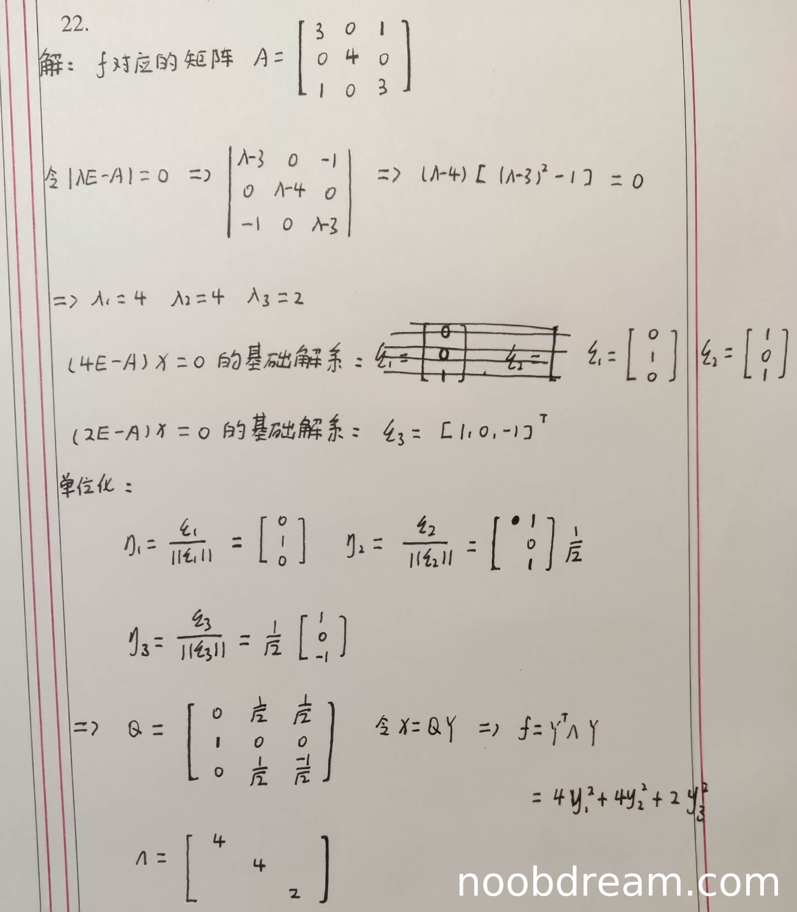 - 正交矩阵Q构造错误:由于特征向量选取错误导致Q错误,应扣1分