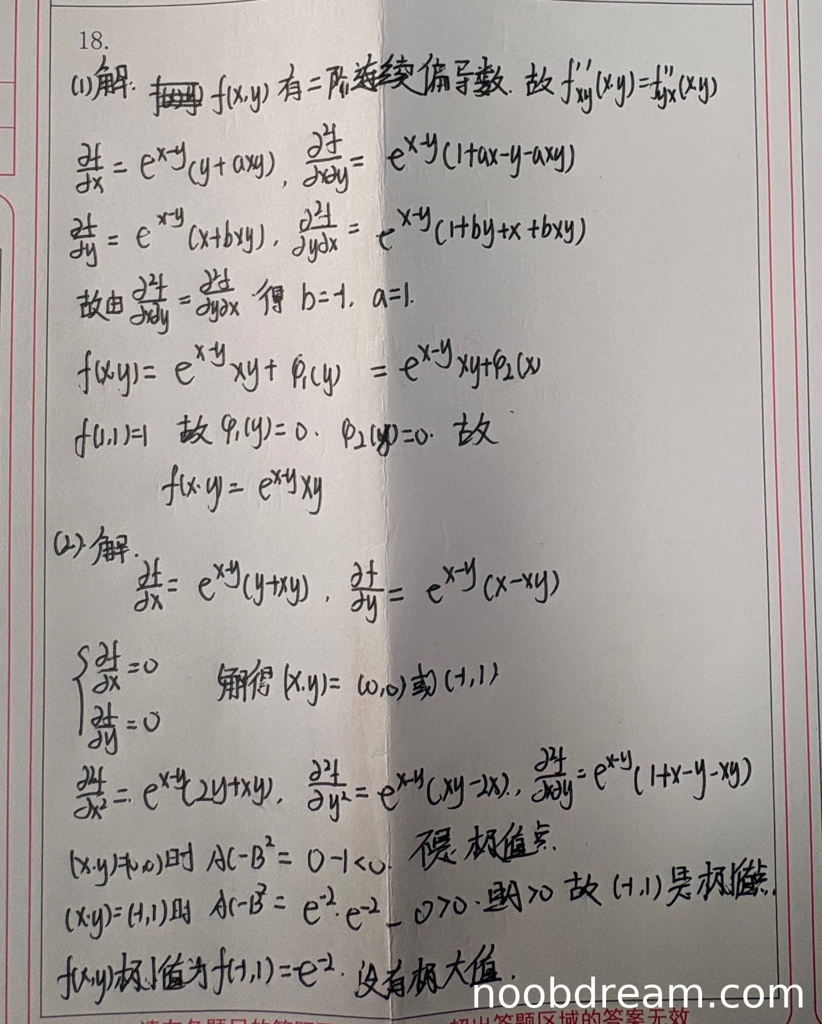 - 对(-1,1)点判断正确,但极小值计算错误:f(-1,1)应为-e⁻²,写成了e⁻²