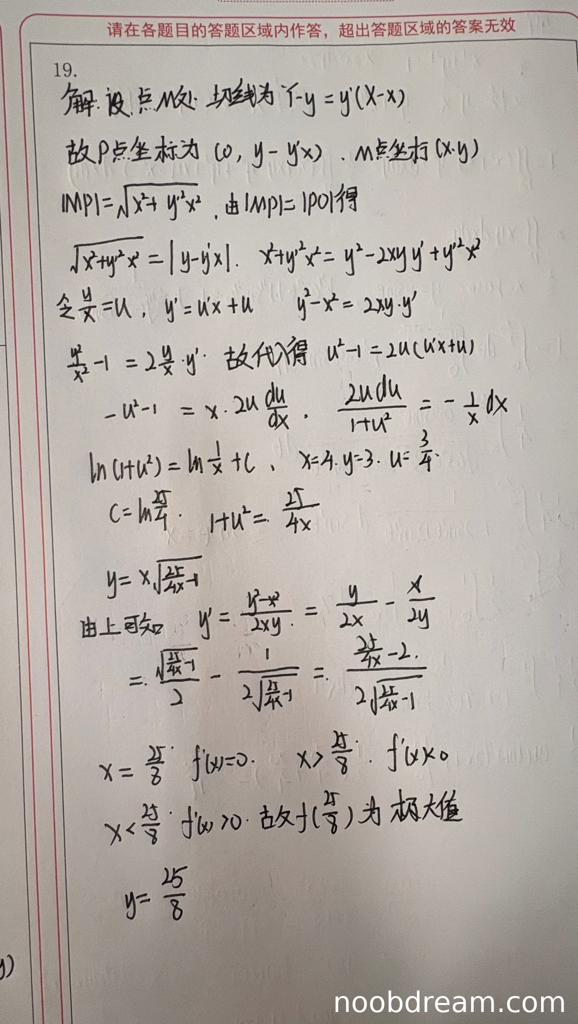 考虑到学生最终得到了正确的曲线方程 \(y = x\sqrt{\frac{25}{4x}-1}\)(即 \(y^2 = \frac{25}{4}x - x^2\))和极大值 \(y = \frac{25}{8}\),且极值分析正确,仅中间步骤书写不够严谨,扣1分。