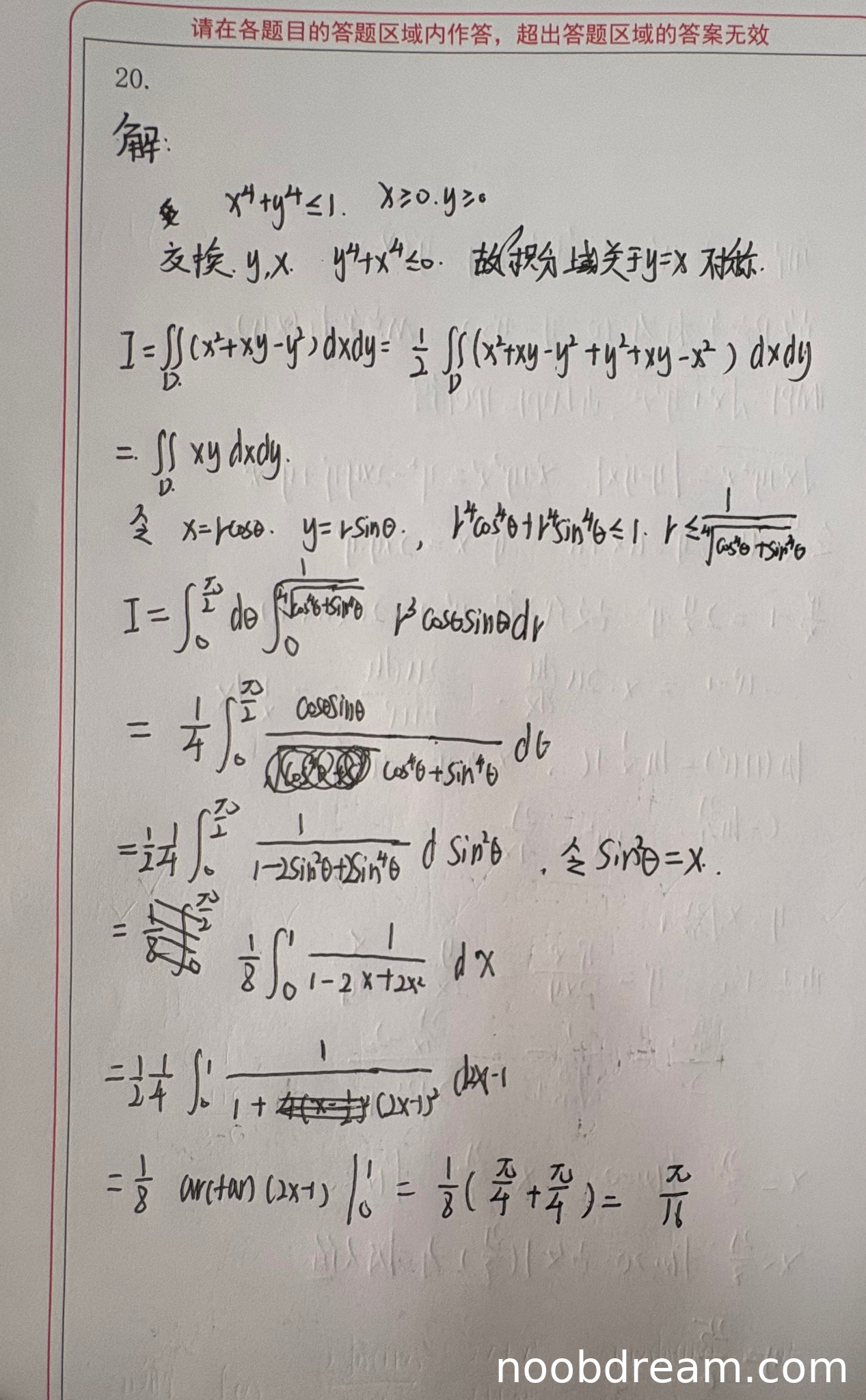 学生正确进行了极坐标变换:x=rcosθ, y=rsinθ,正确确定了积分限θ∈[0,π/2],r的上限为1/⁴√(cos⁴θ+sin⁴θ)。