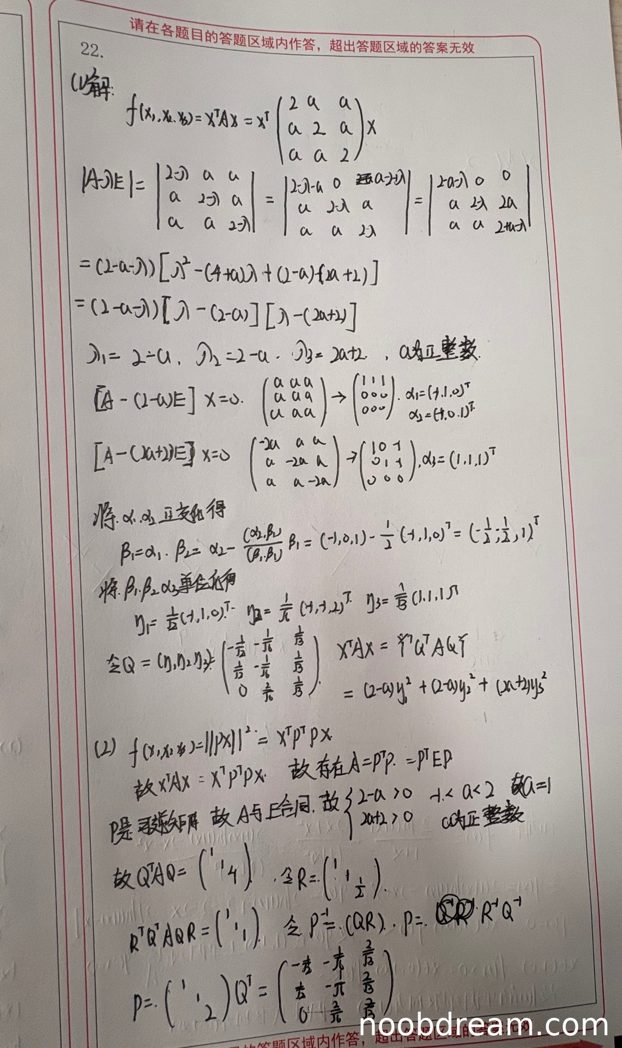 - 在构造P的过程中,思路正确:通过QᵀAQ=diag(1,1,4),再构造对角矩阵R=diag(1,1,1/2)使得RᵀQᵀAQR=E,得1分。