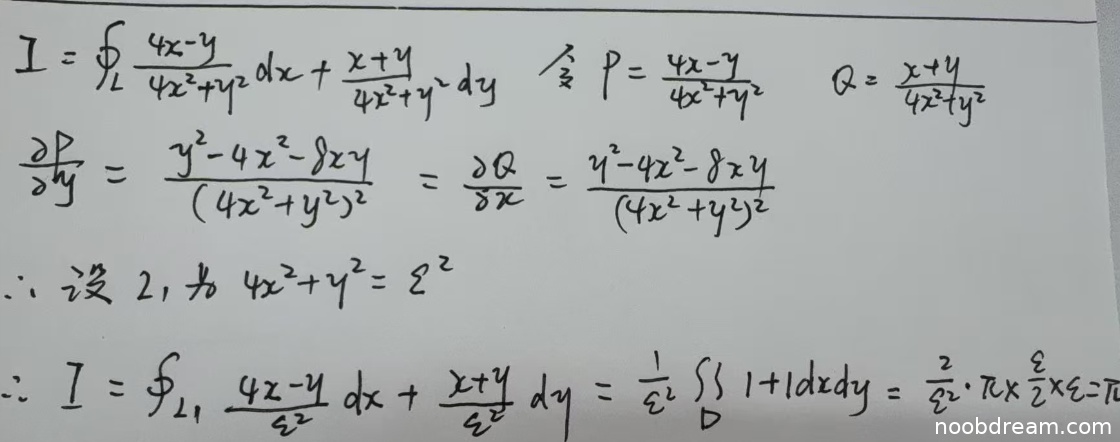 - 正确定义了P和Q函数,并正确计算了偏导数 ∂P/∂y 和 ∂Q/∂x,得出两者相等的结果。