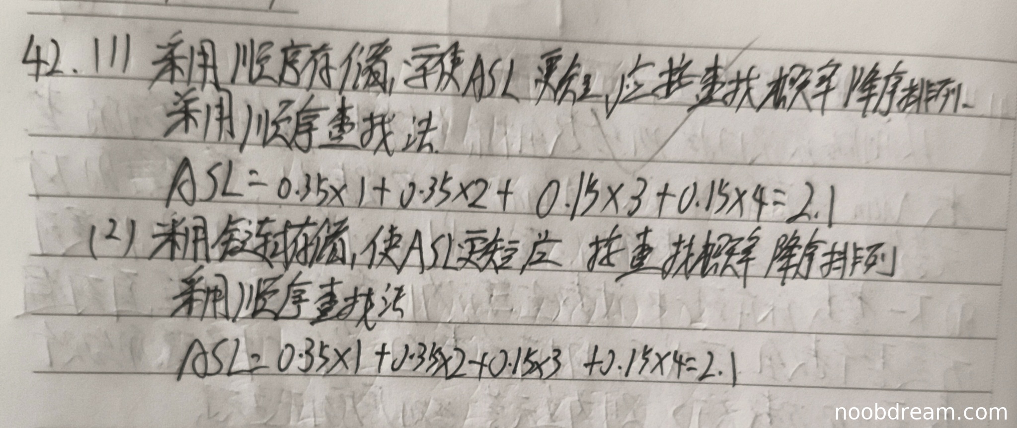 学生答案正确指出采用顺序存储结构时,应按查找概率降序排列(2分),采用顺序查找方法(1分),并正确计算了平均查找长度为2.1(2分)。两次识别结果均正确,得5分。