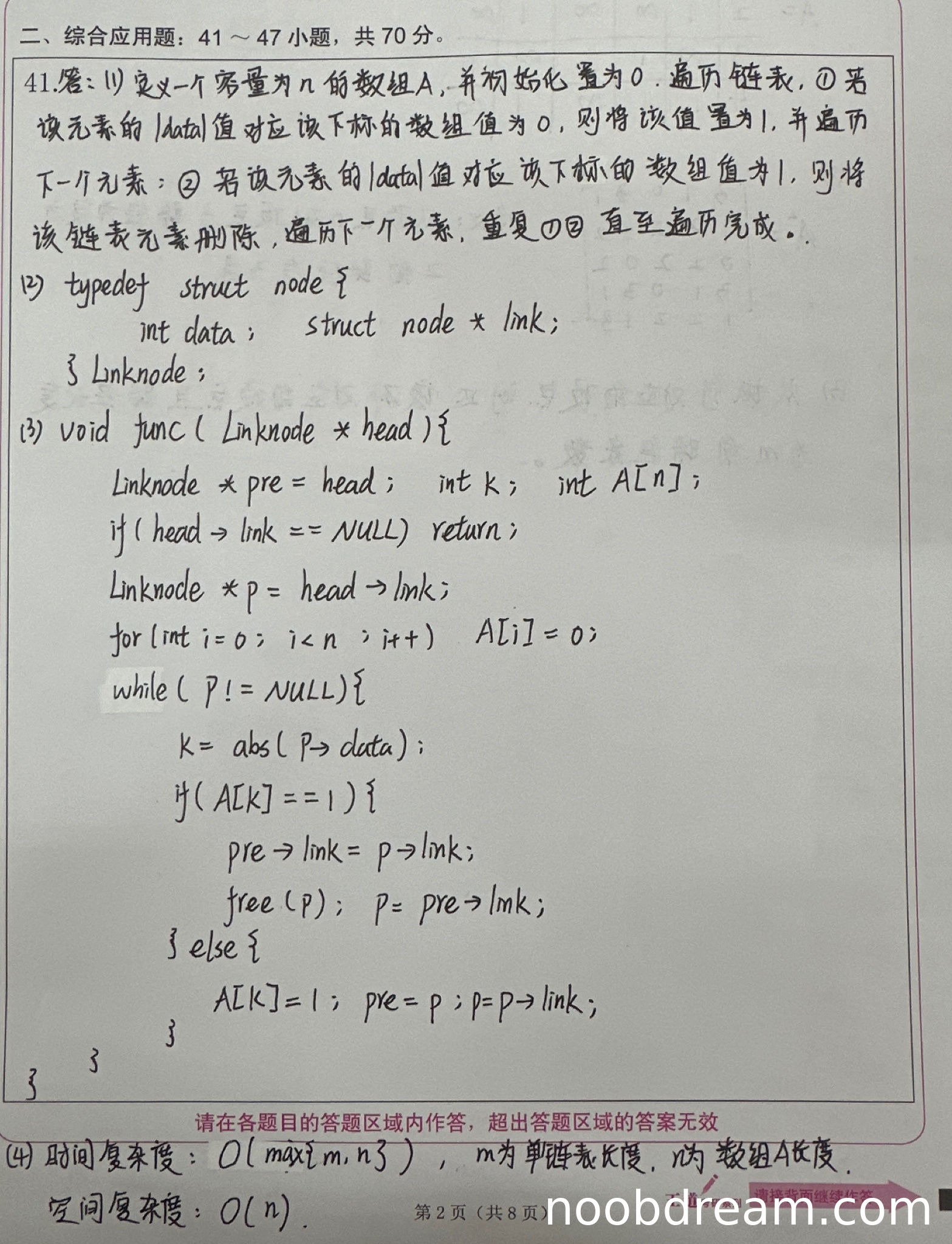 理由:空间复杂度分析正确为O(n),得1分。但时间复杂度分析为O(max{m,n})不够准确,应该是O(m),因为主要时间消耗在遍历链表上,数组初始化可以忽略或视为O(n)但通常m≥n,所以准确说是O(m)。此处扣1分。
