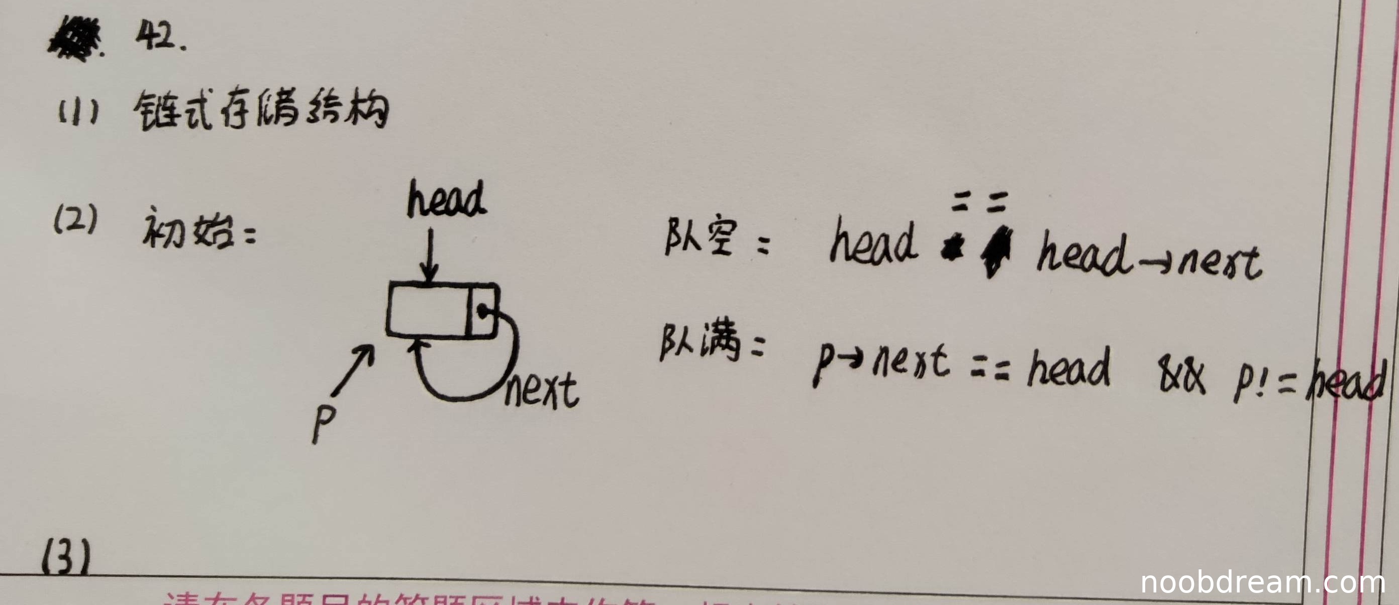 学生回答的队空条件"head == head→next"基本正确,但队满条件"p→next == head && p!= head"表述不够清晰,没有明确定义p的含义。标准答案中使用了明确的前后指针关系来判断队满。考虑到学生理解了循环链表的基本思想,但表达不够完整,扣1分,得3分。