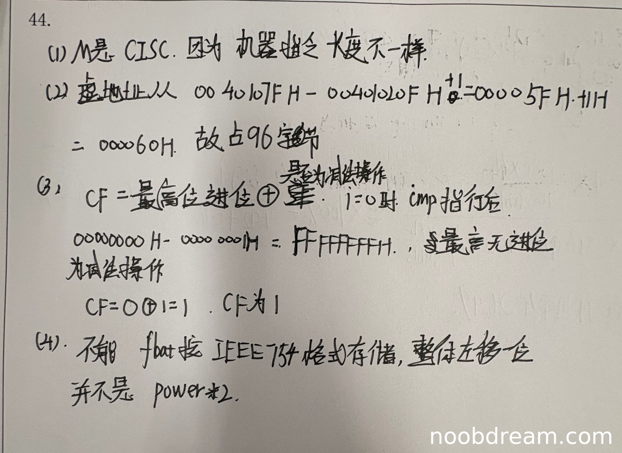 学生正确指出CF = 最高位进位⊕1,并说明是减法操作。计算过程:i=0时,00000000H - 00000001H = FFFFFFFFH,最高位无进位(C=0),CF=0⊕1=1。虽然学生写的是“00000000H - 00000001H”而不是标准答案中的“n-1=FFFFFFFFH”,但计算过程正确,结果正确。得3分。